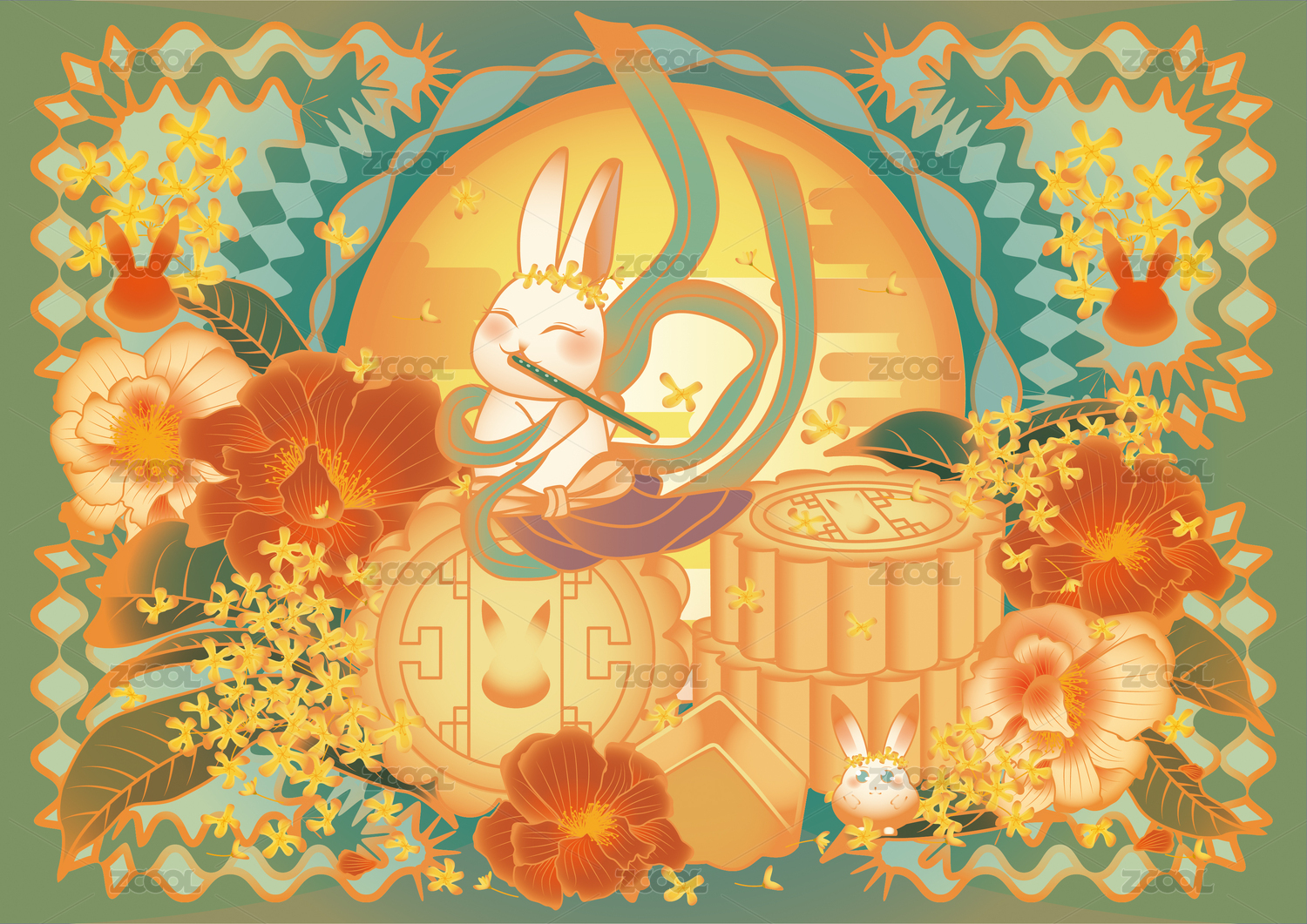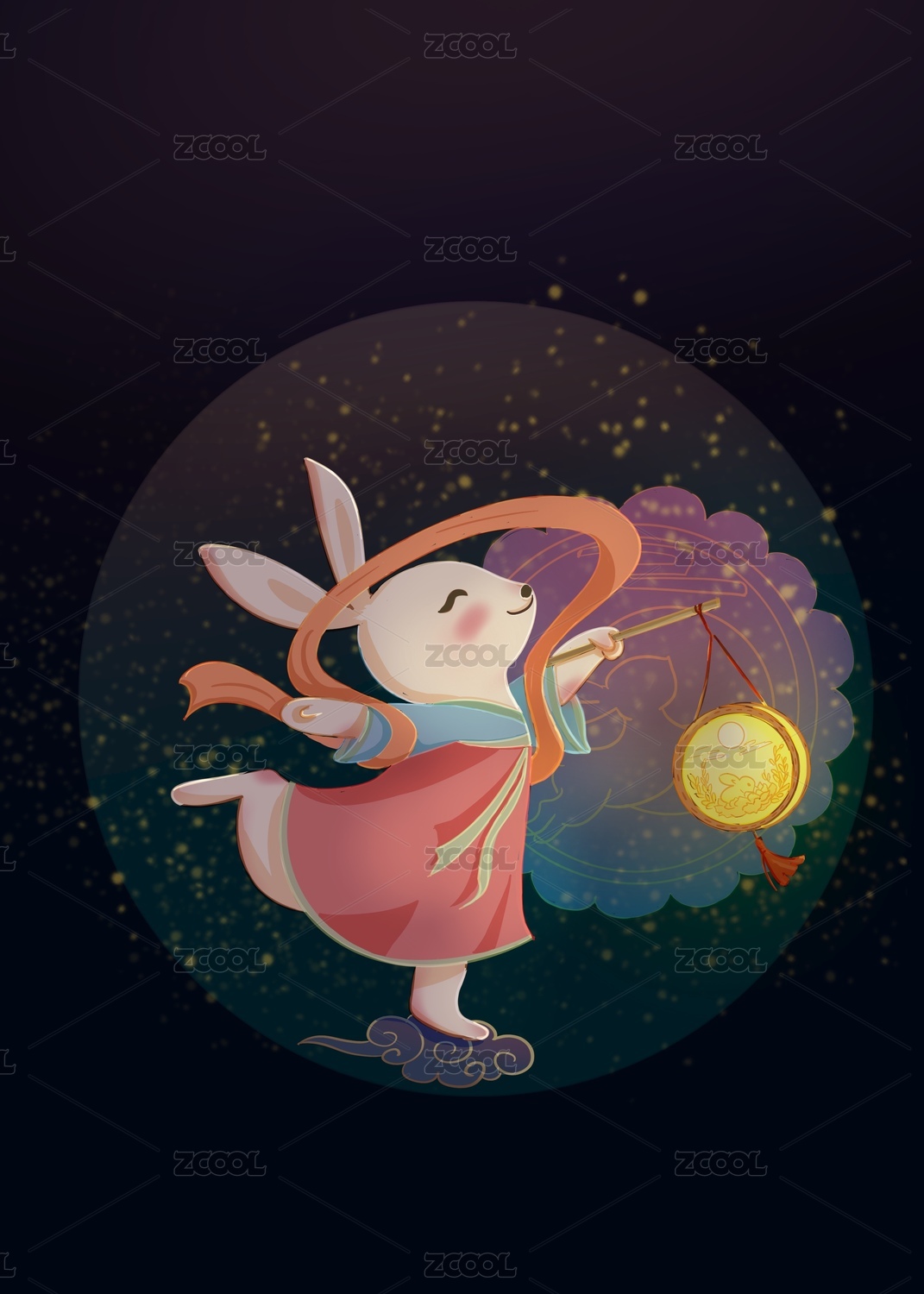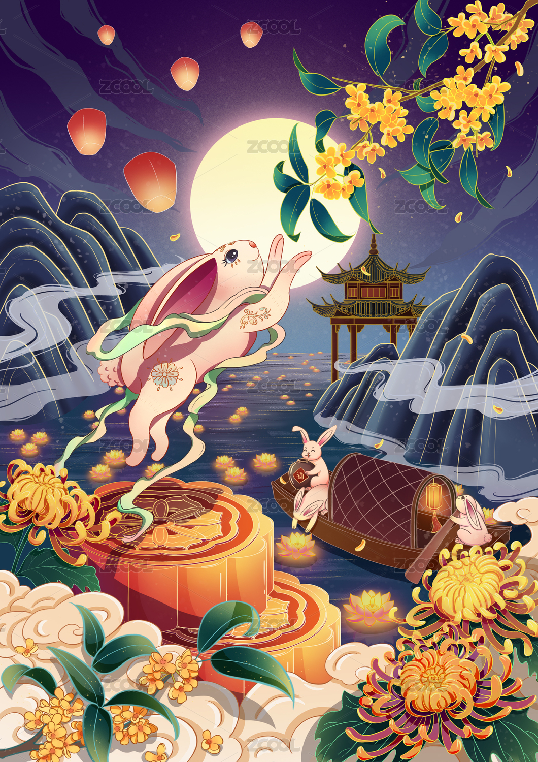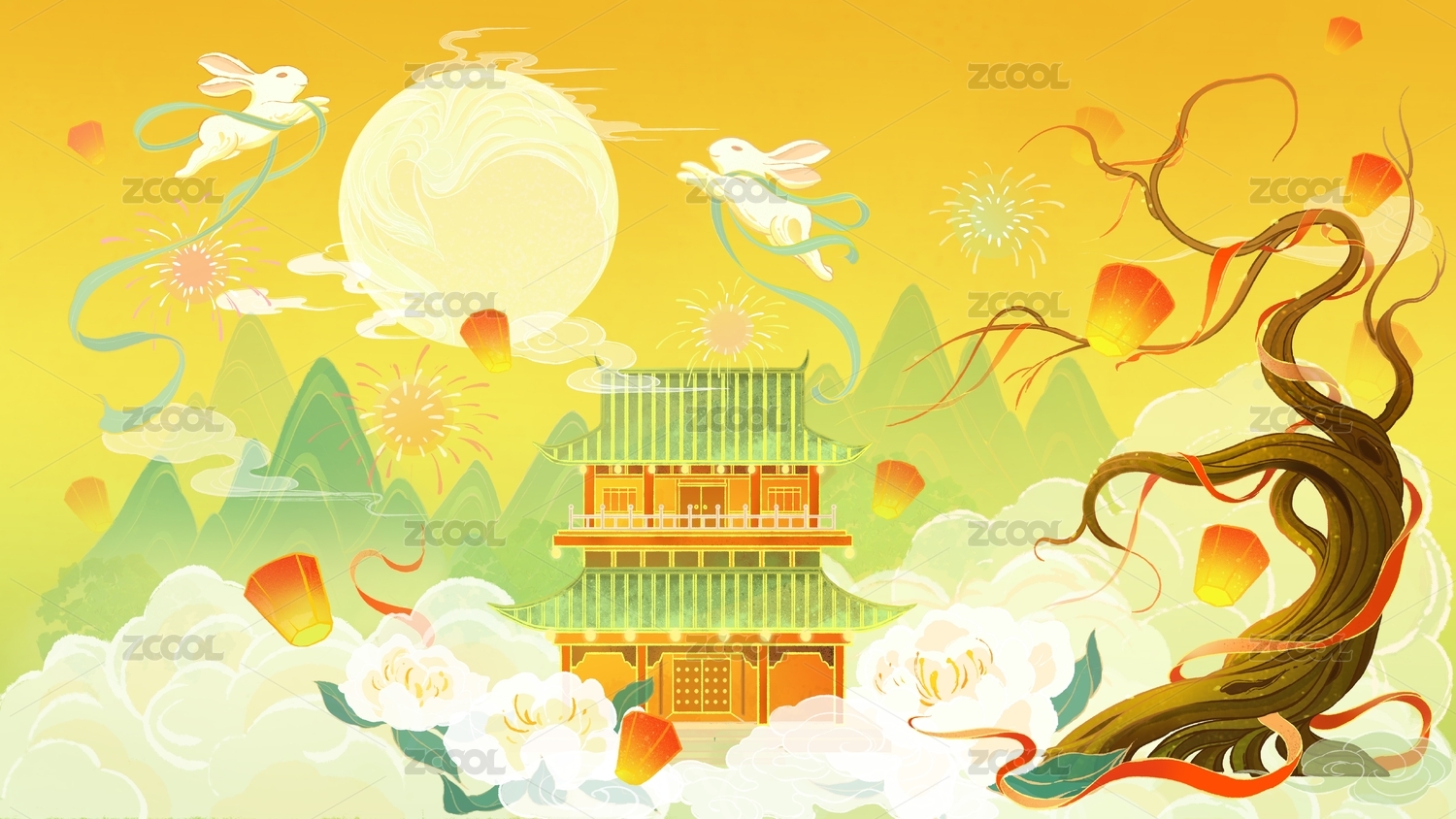 中秋佳節(jié) 八月十五明月玉兔山川河流星空 矢量 插畫