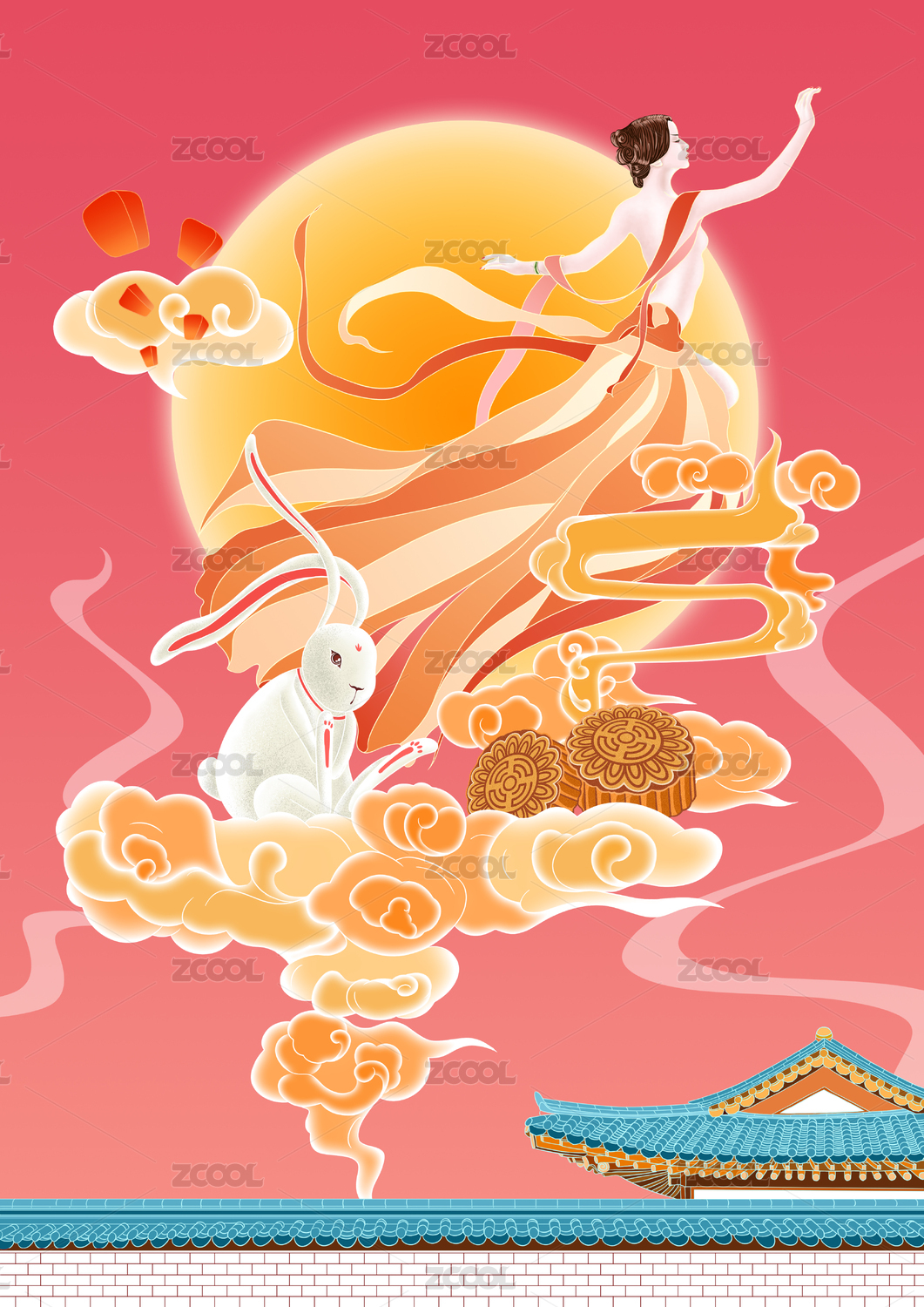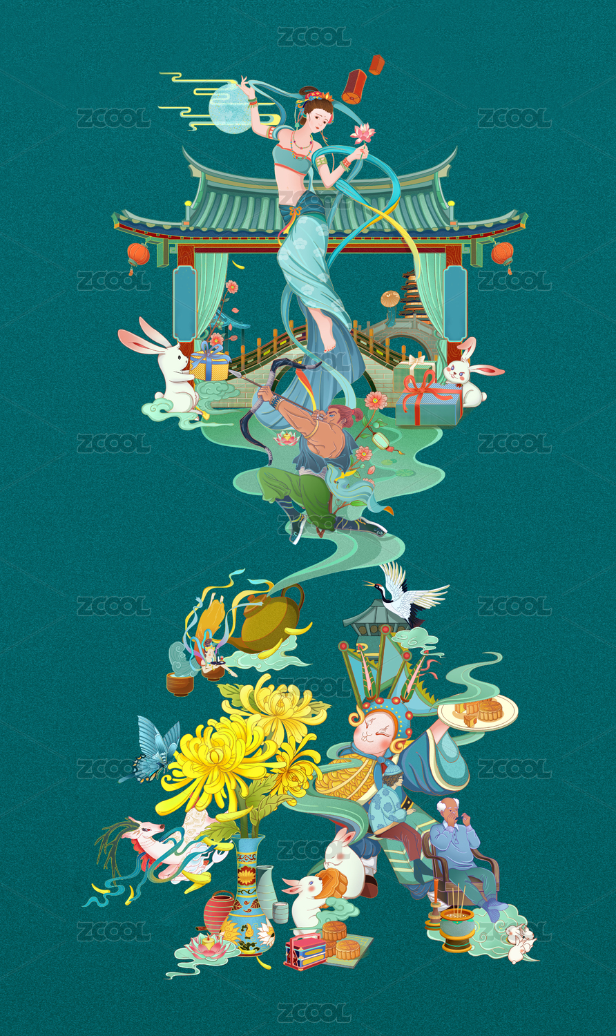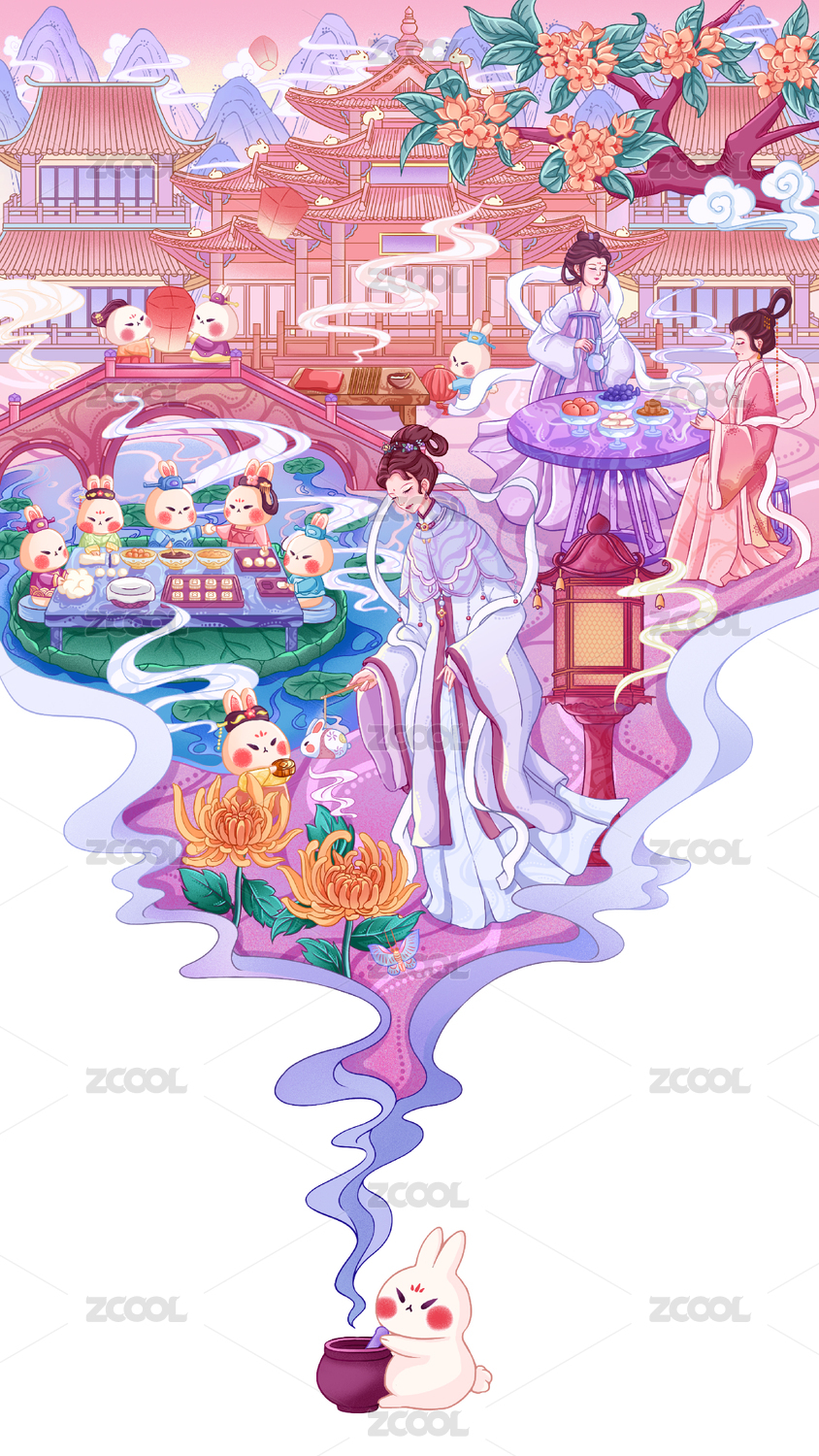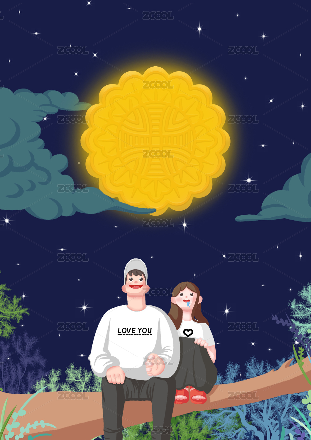 中秋佳節(jié) 八月十五明月玉兔山川河流星空 矢量 插畫