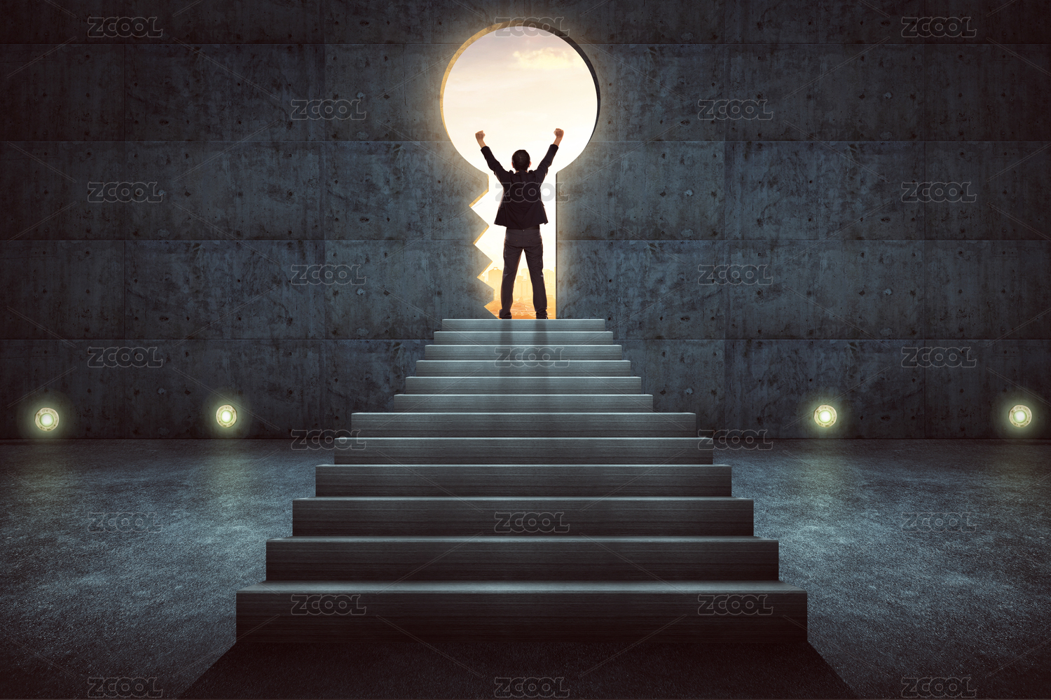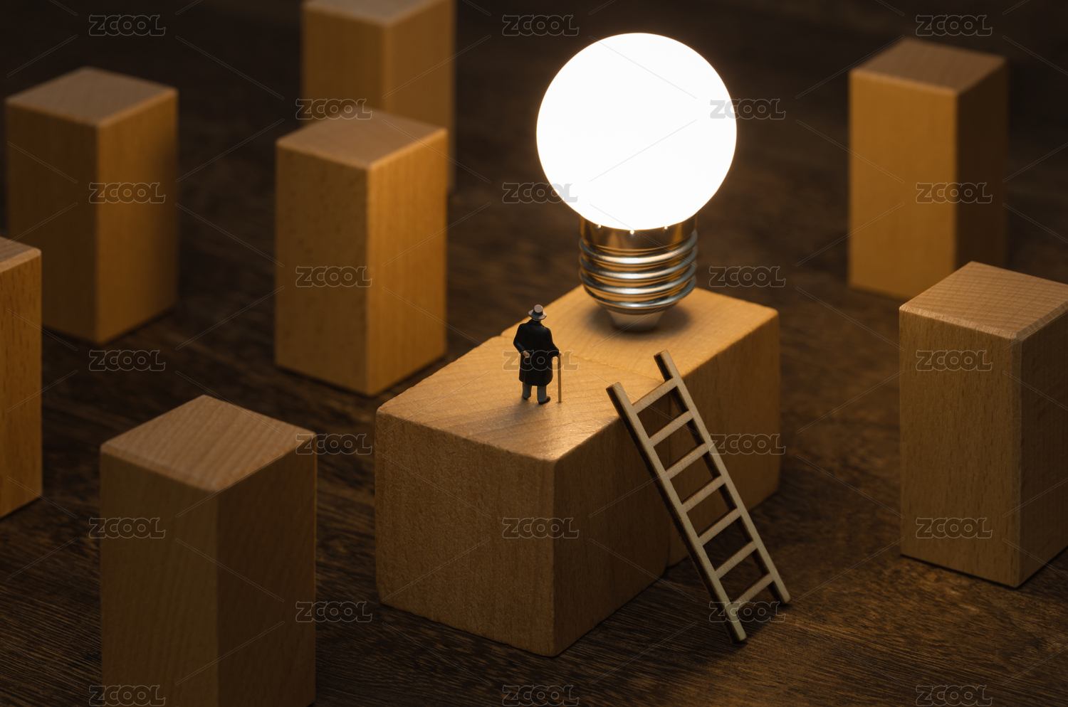微縮創(chuàng)意積木階梯上發(fā)亮的燈泡和成功人士