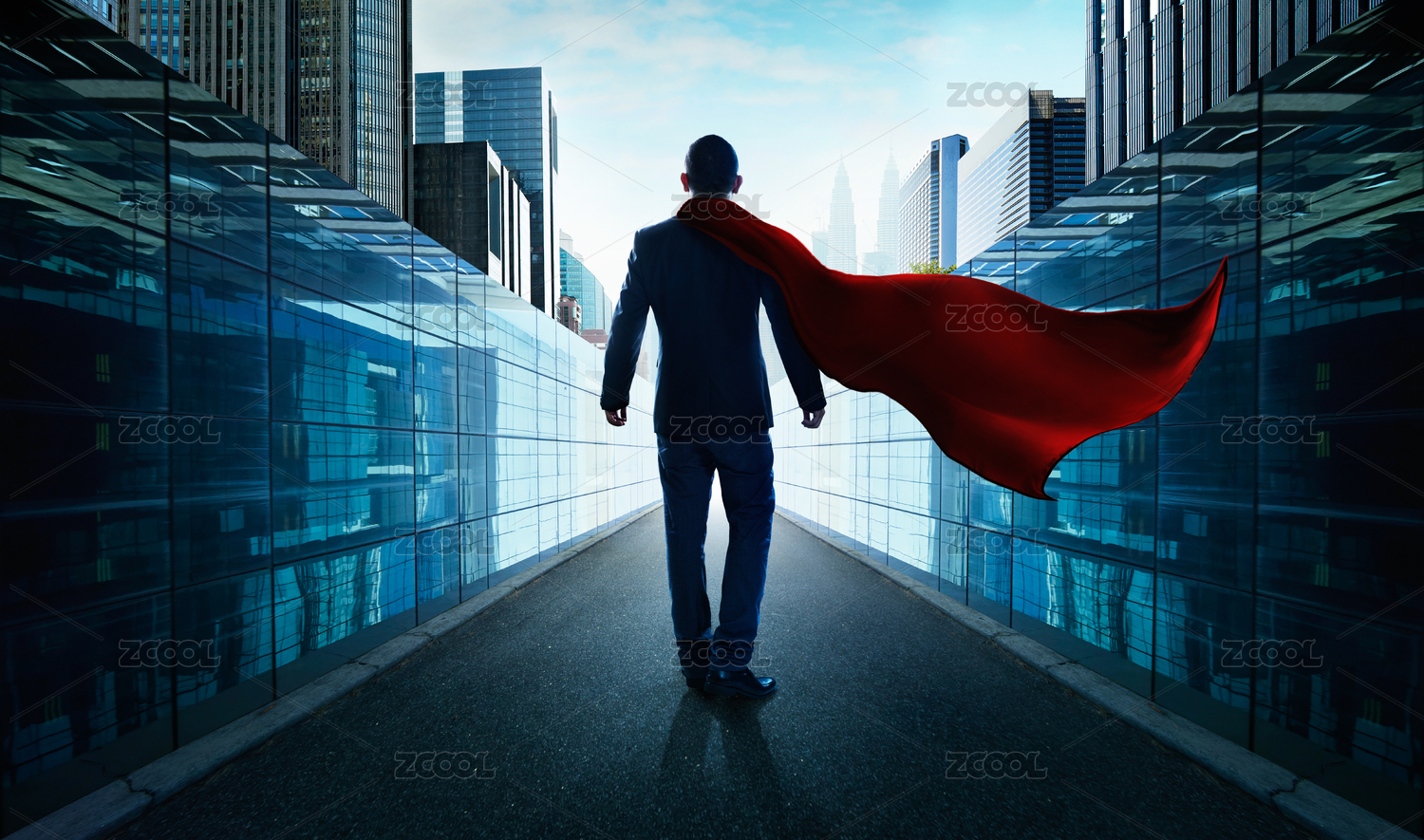 穿著超人披風(fēng)的商人站在山頂,商業(yè)成功概念圖。
