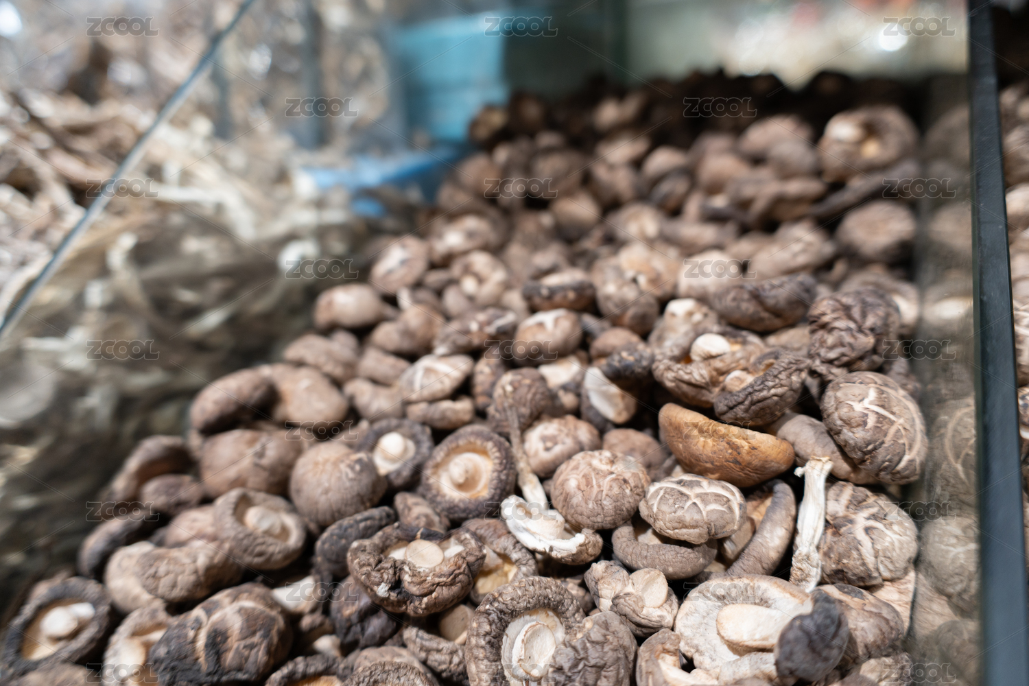 亞洲中國超市的亞克力貨架上擺滿了干蘑菇