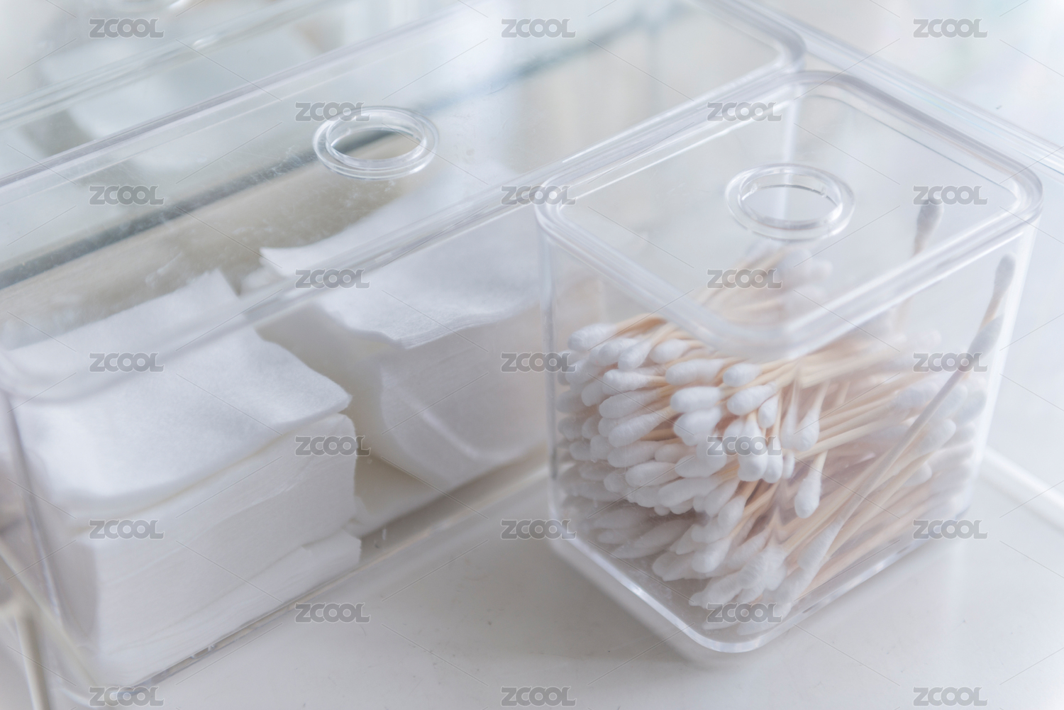化妝桌上透明亞克力盒子里的化妝棉和棉簽