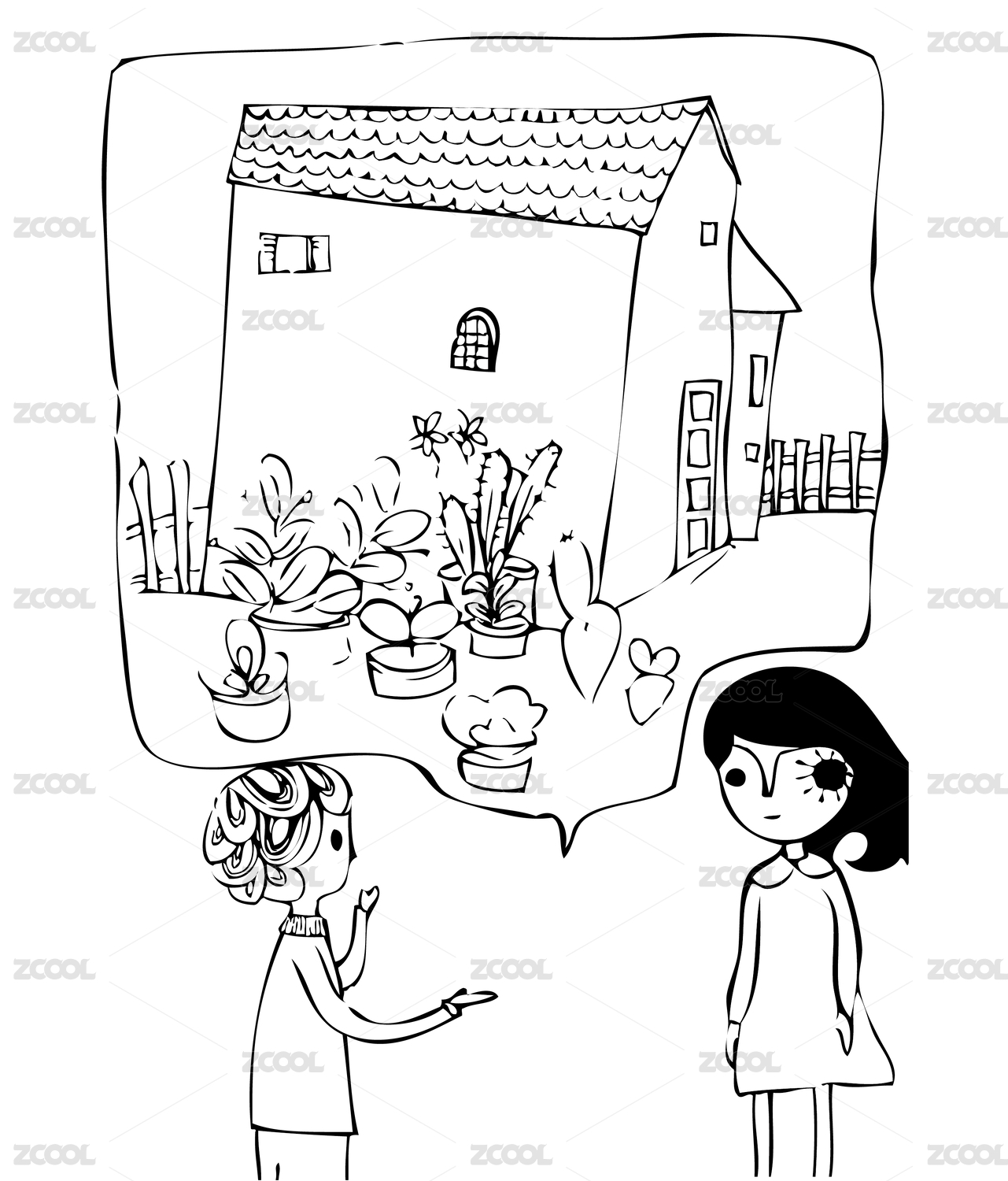 小女孩的煩惱 線描 線描裝飾畫 黑白畫 手繪 心事 情緒 戀愛(ài) 情感