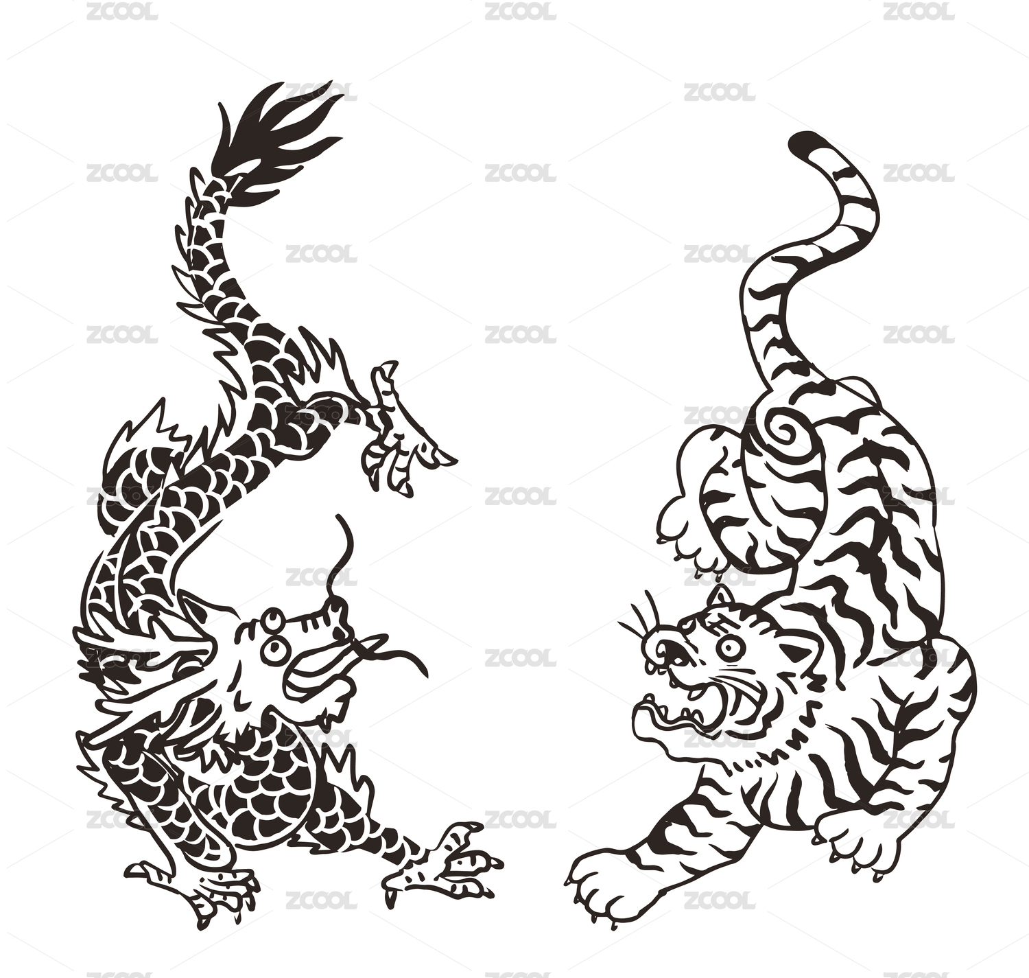 龍和虎傳統(tǒng)紋樣黑白裝飾畫