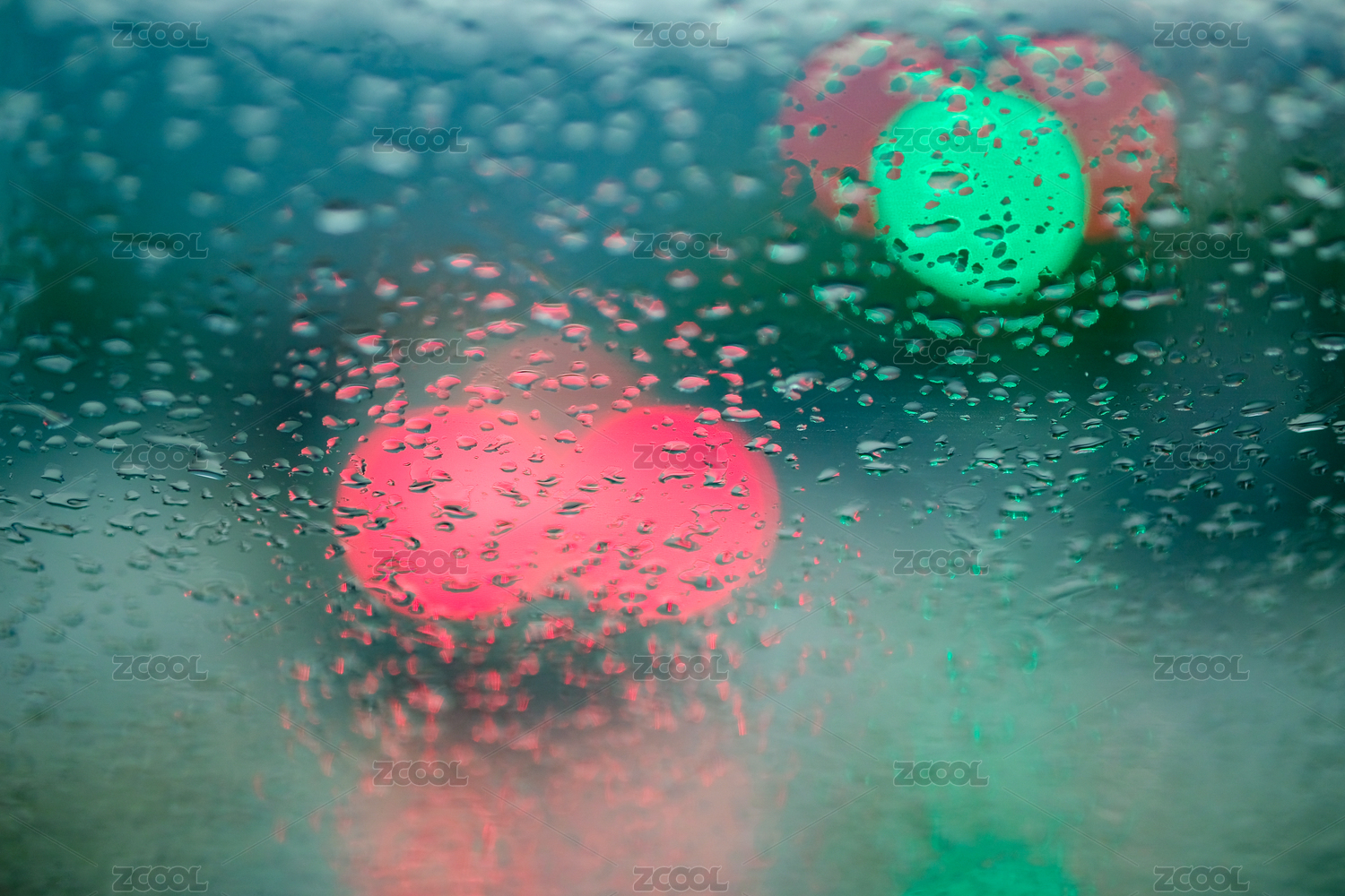 雨天汽車玻璃窗映出紅綠燈車燈