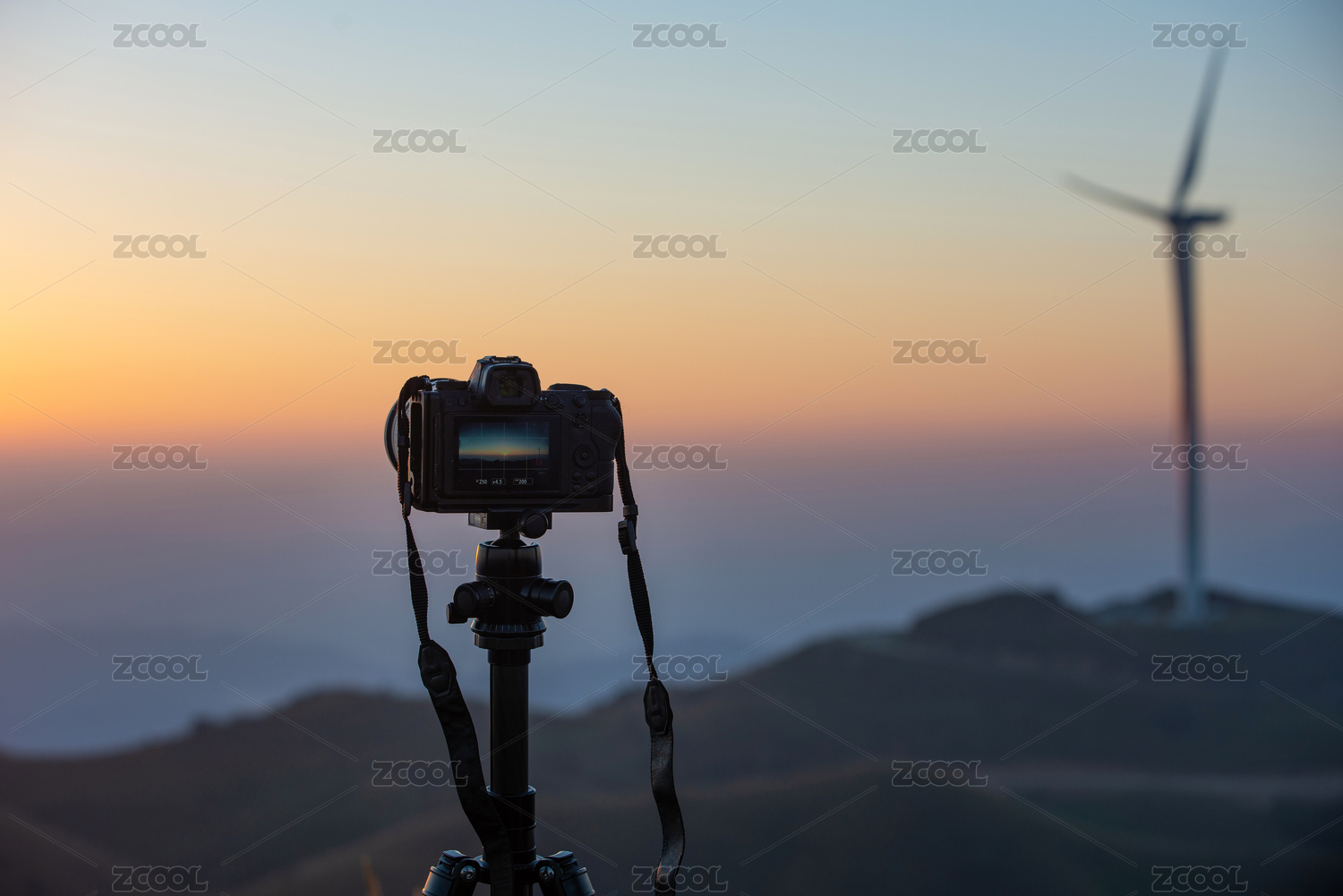 山頂清晨固定在三腳架上拍攝風(fēng)光的相機(jī)