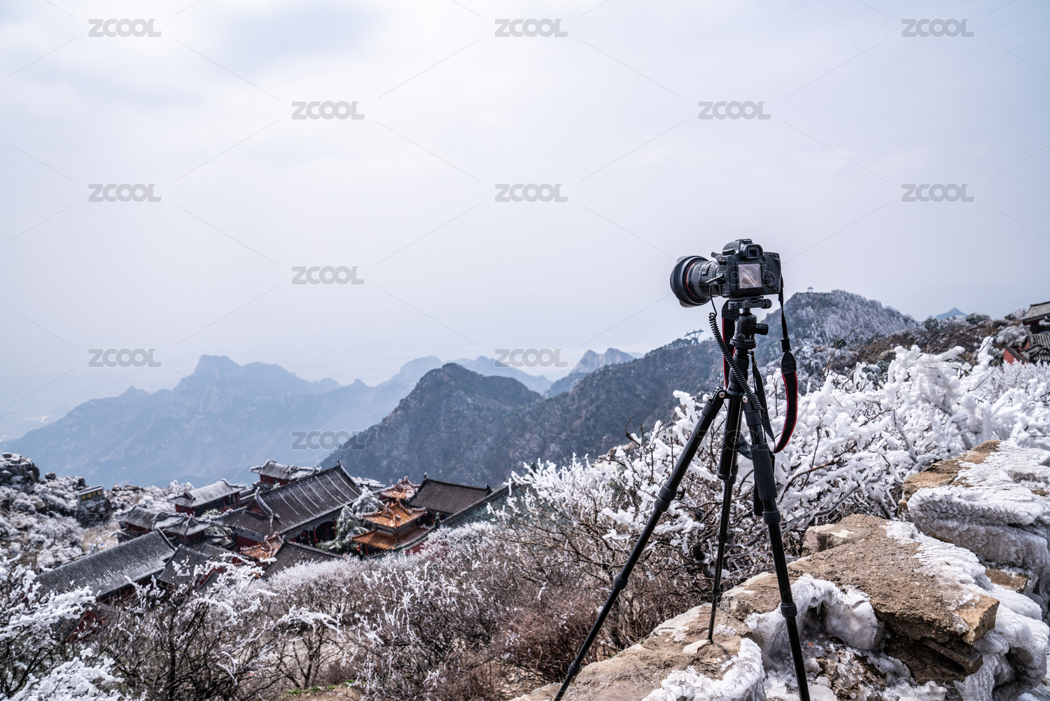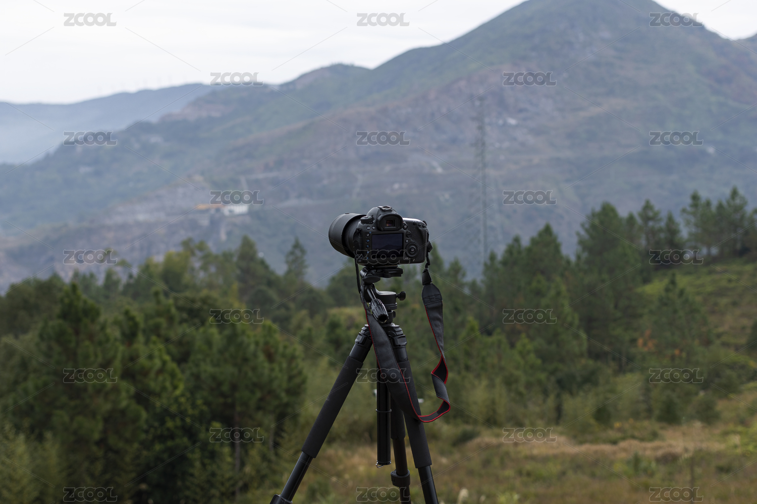 相機(jī)架在三腳架上在山頂拍照