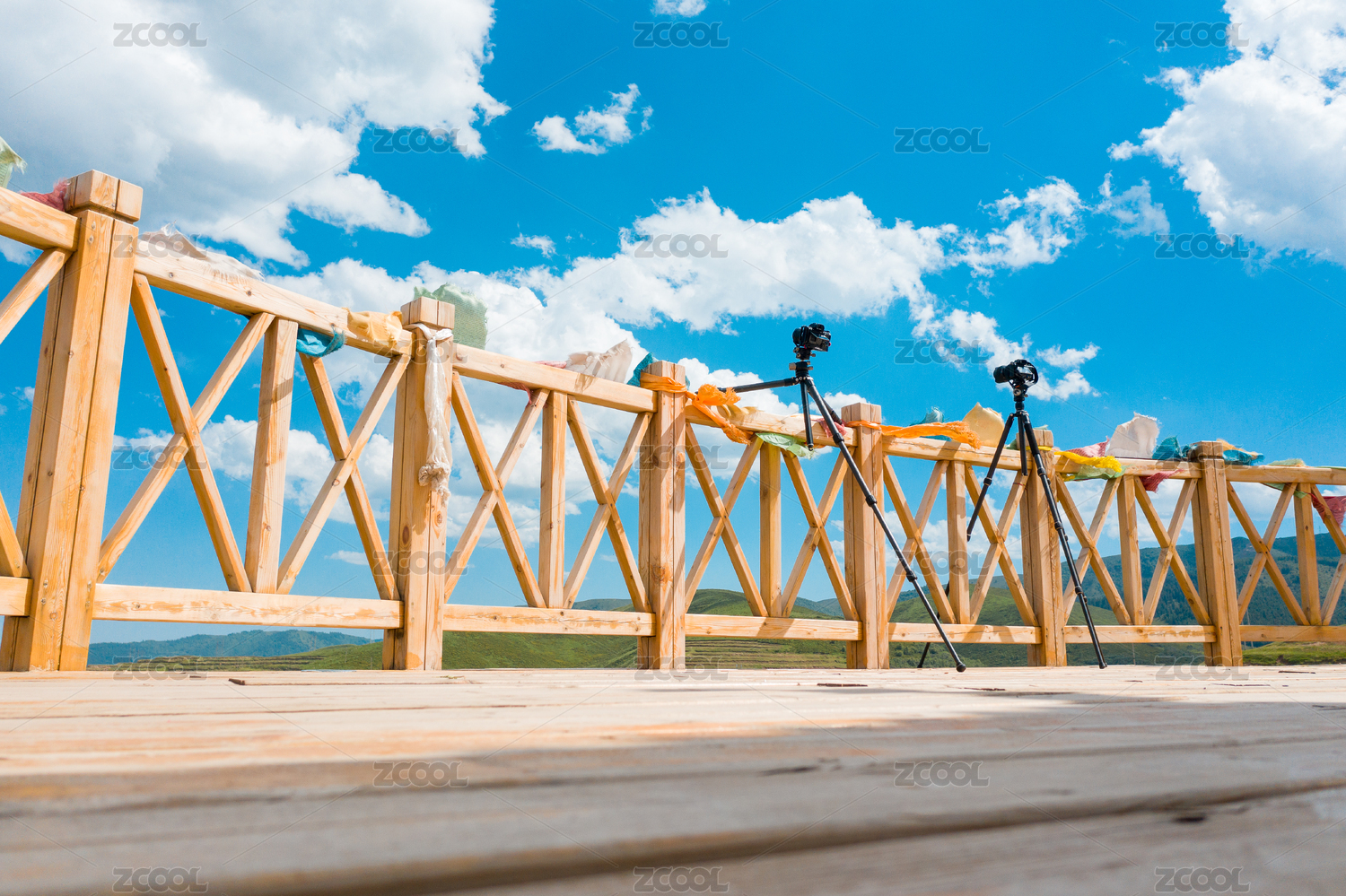 晴朗的藍(lán)天白云下三腳架與相機(jī)正在拍照