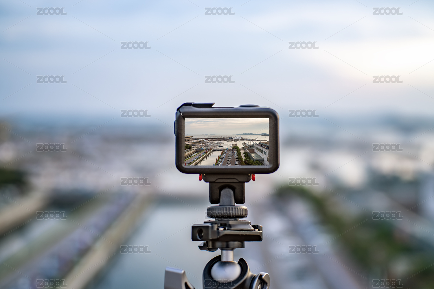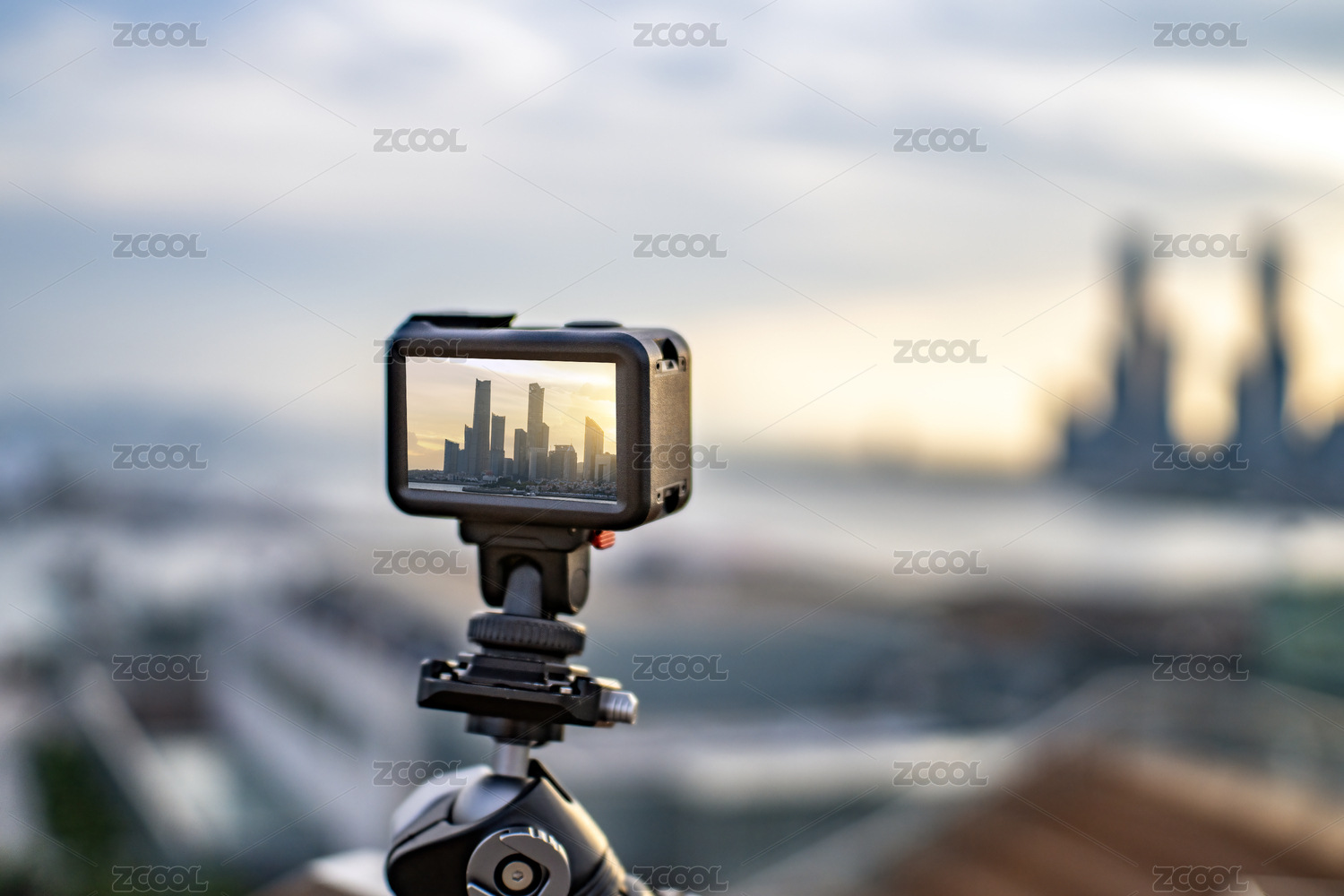 三腳架上的運(yùn)動(dòng)相機(jī)拍攝城市景觀