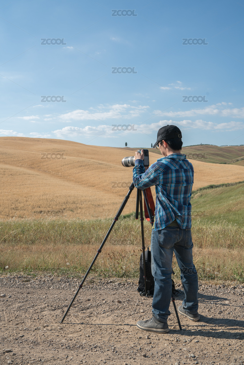 一名男性在田園草原上使用三腳架相機(jī)拍照