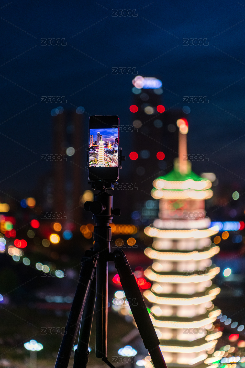 夜晚在三腳架上拍攝城市地標(biāo)夜景的手機(jī)