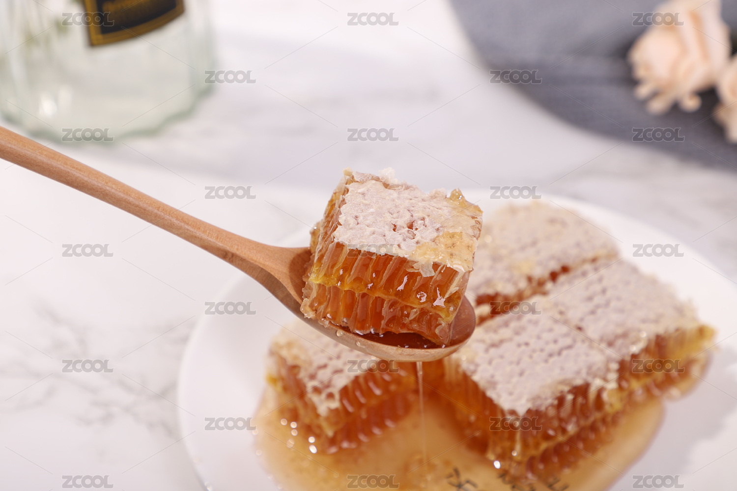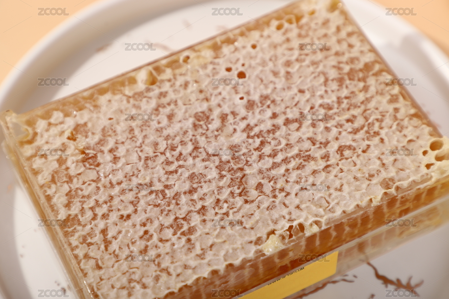 淺色背景下的碟盤里的蜂巢蜜特寫擺盤