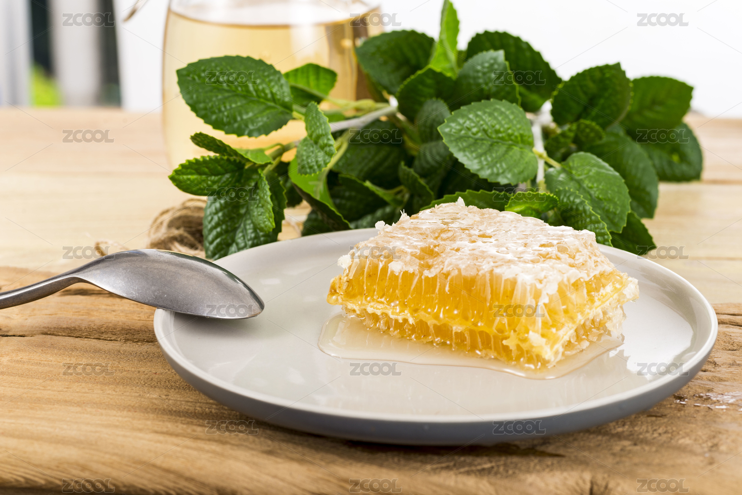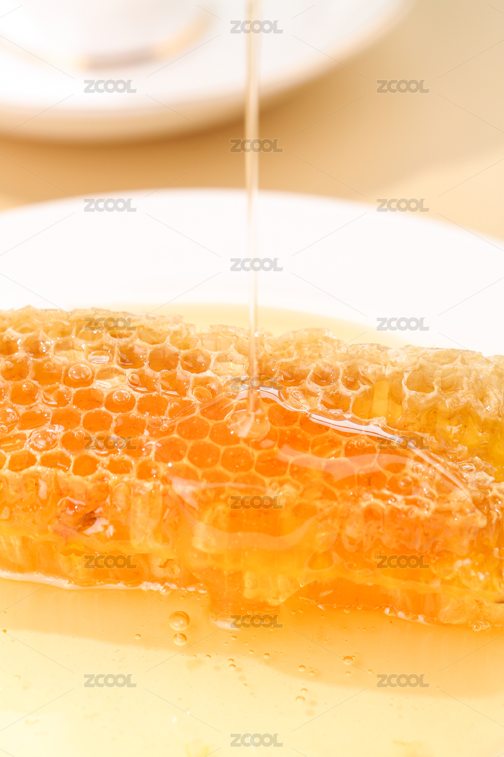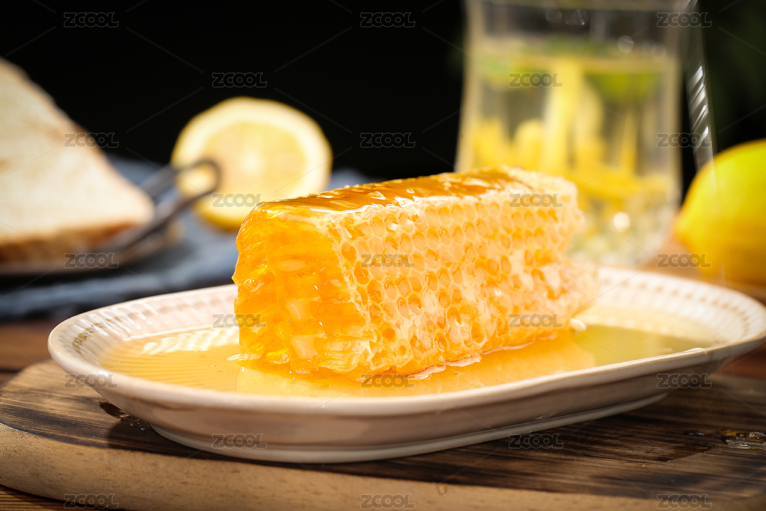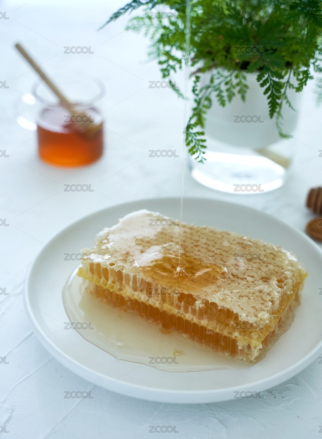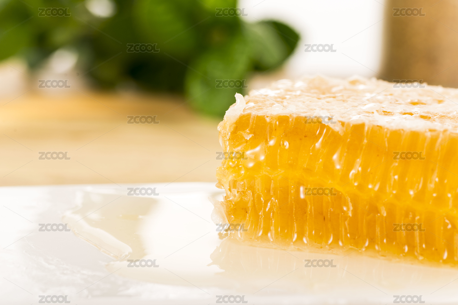 淺色背景下的碟盤里的蜂巢蜜特寫