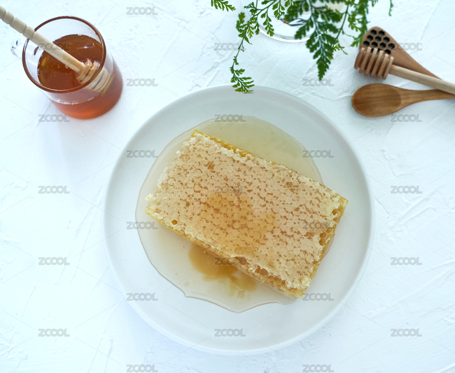 淺色背景下的碟盤里的蜂巢蜜俯拍