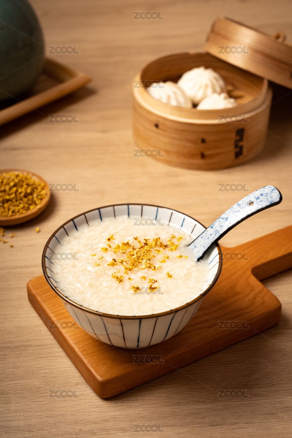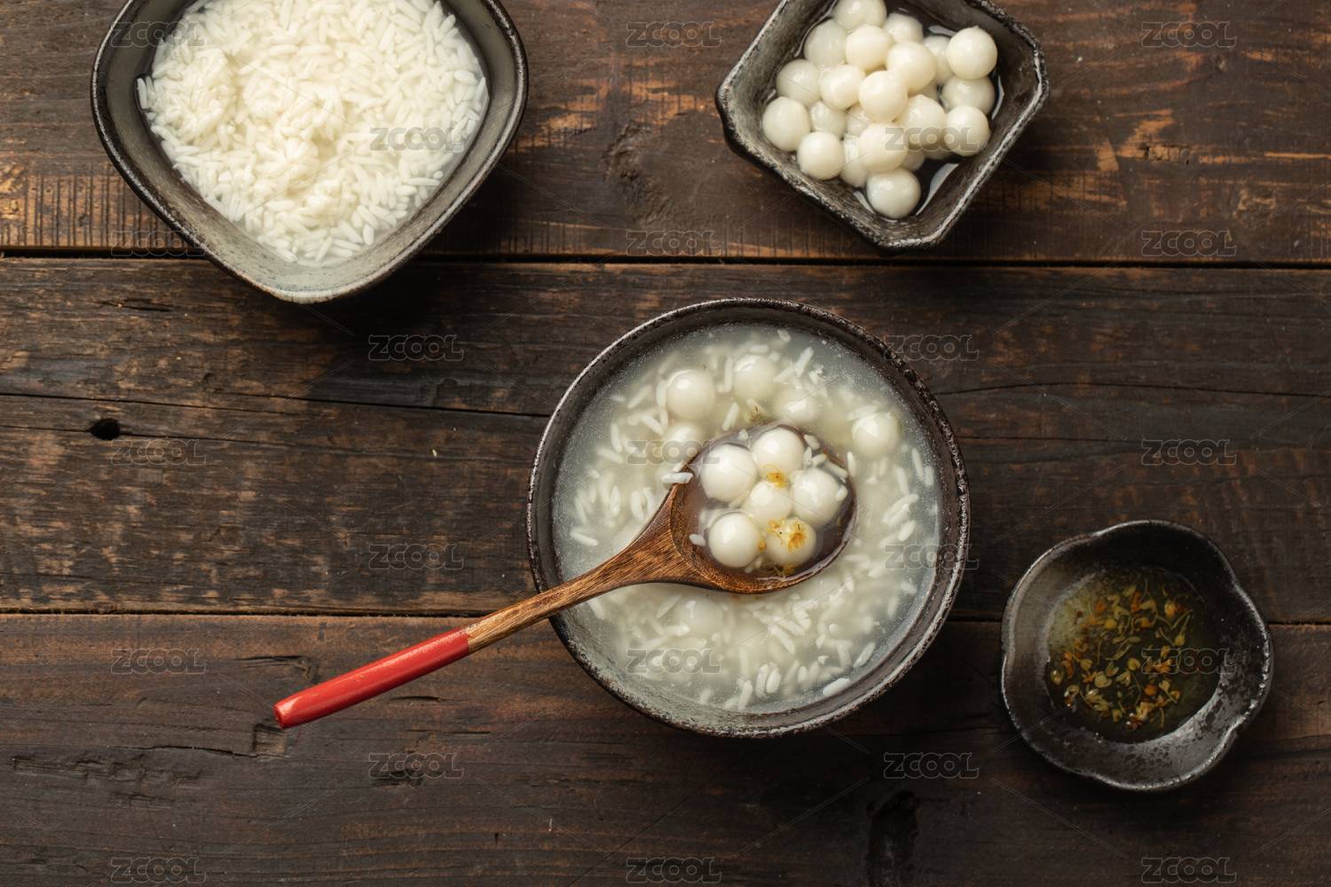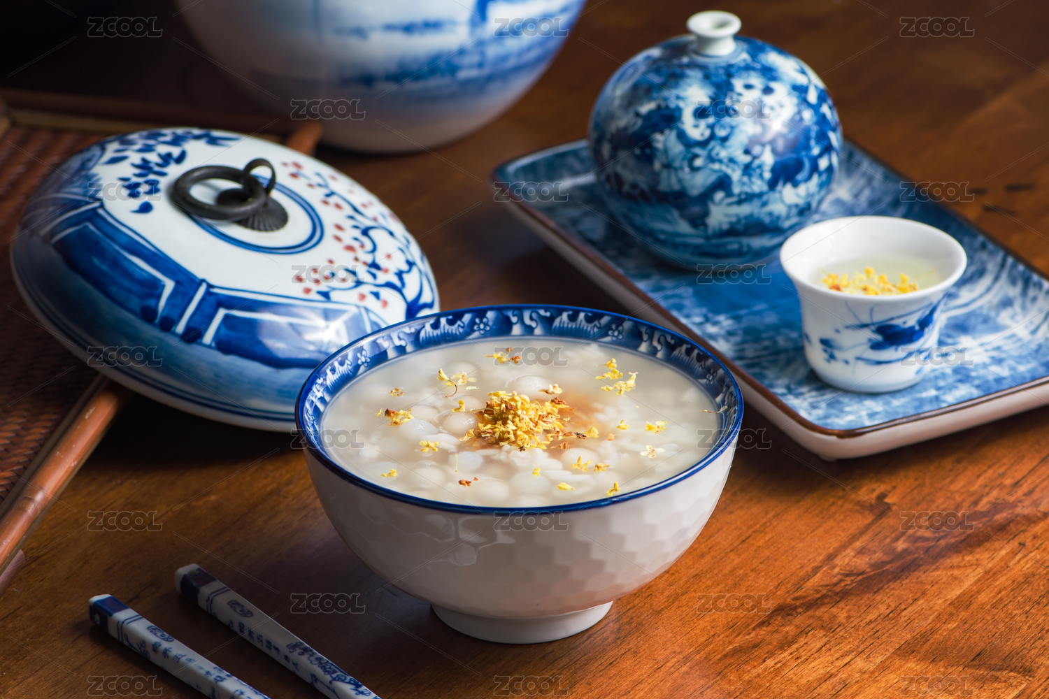用青花瓷碗裝的桂花酒釀小圓子放置在木桌上