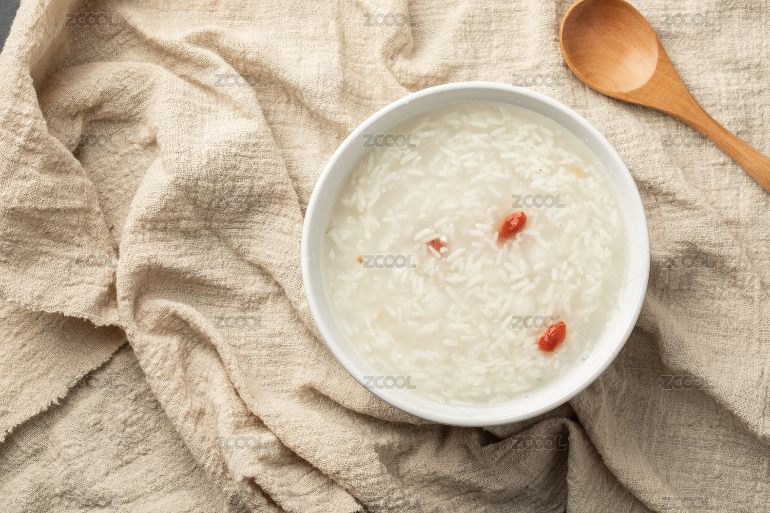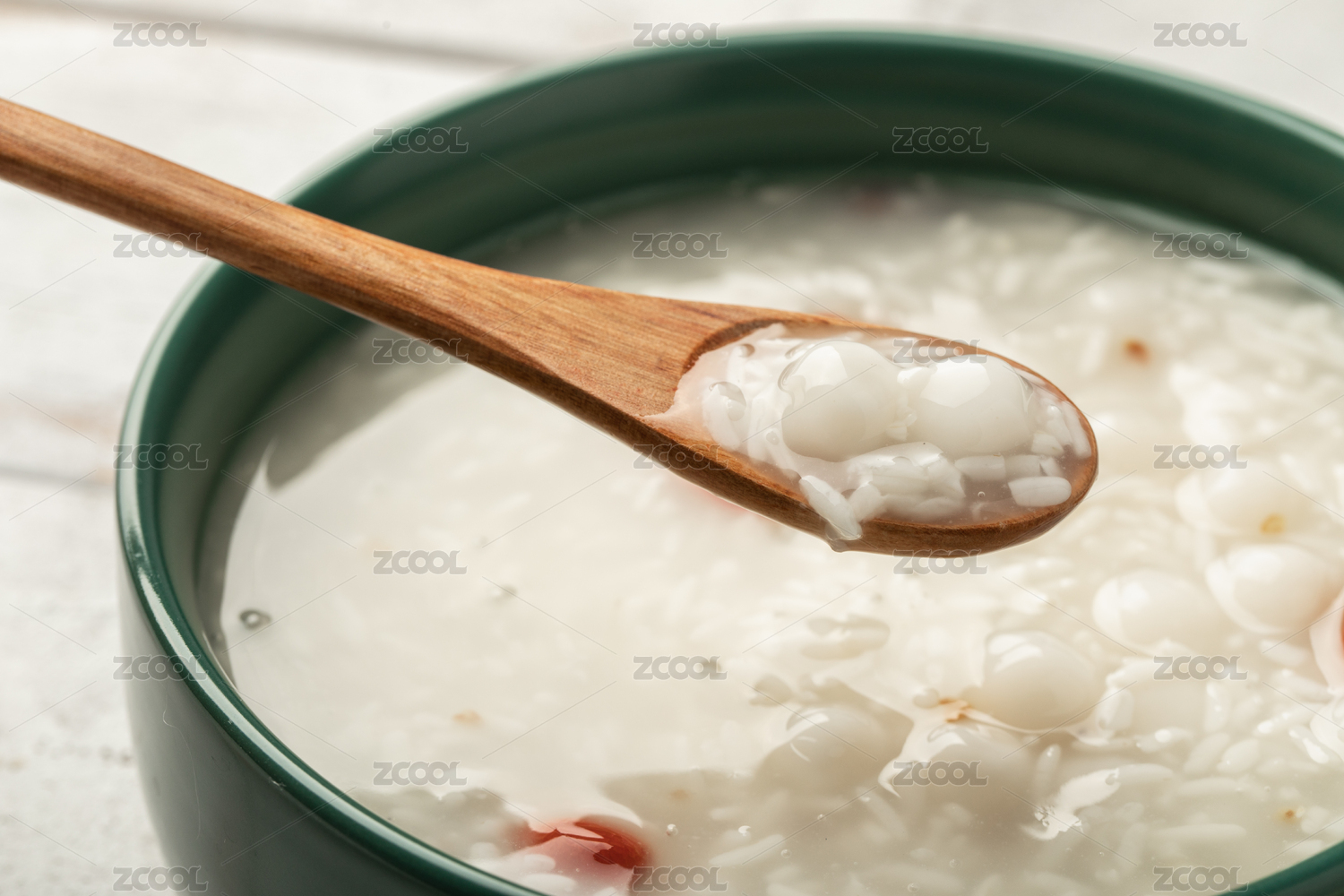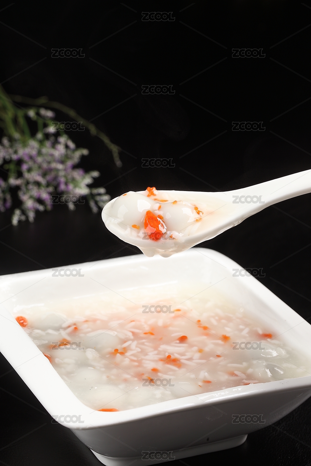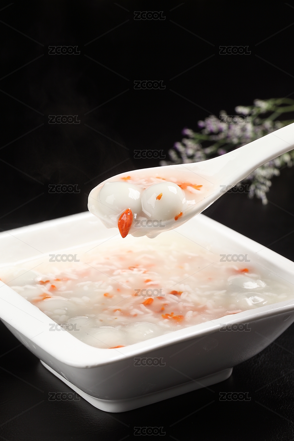 用青花瓷碗裝的桂花酒釀小圓子放置在木桌上