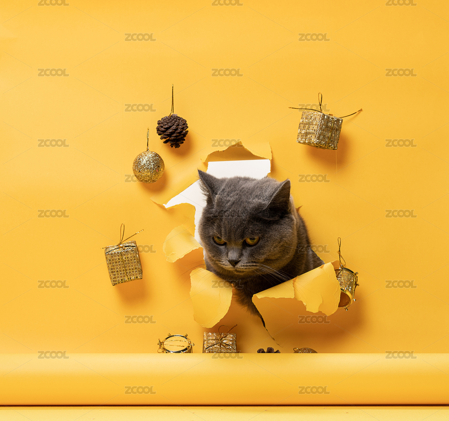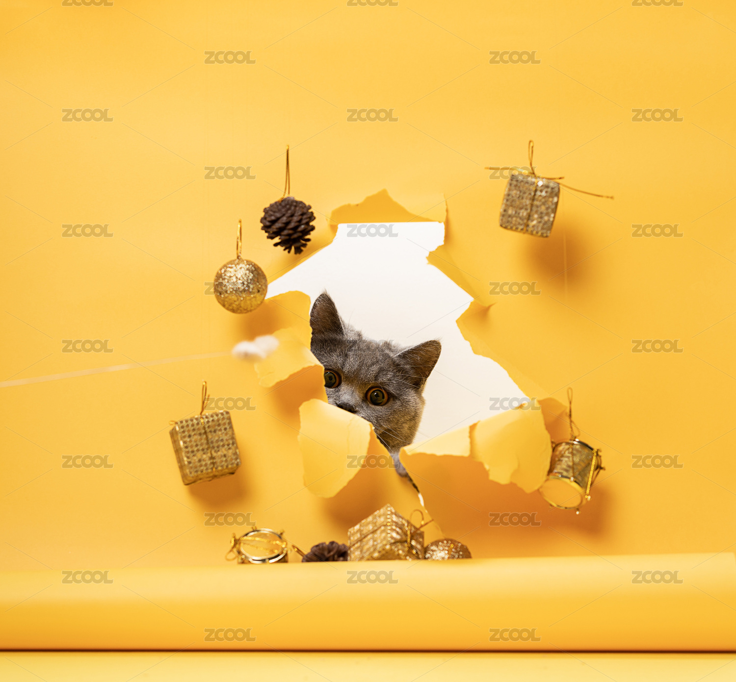 英短藍貓動態(tài)抓拍,黃色鏤空創(chuàng)意背景