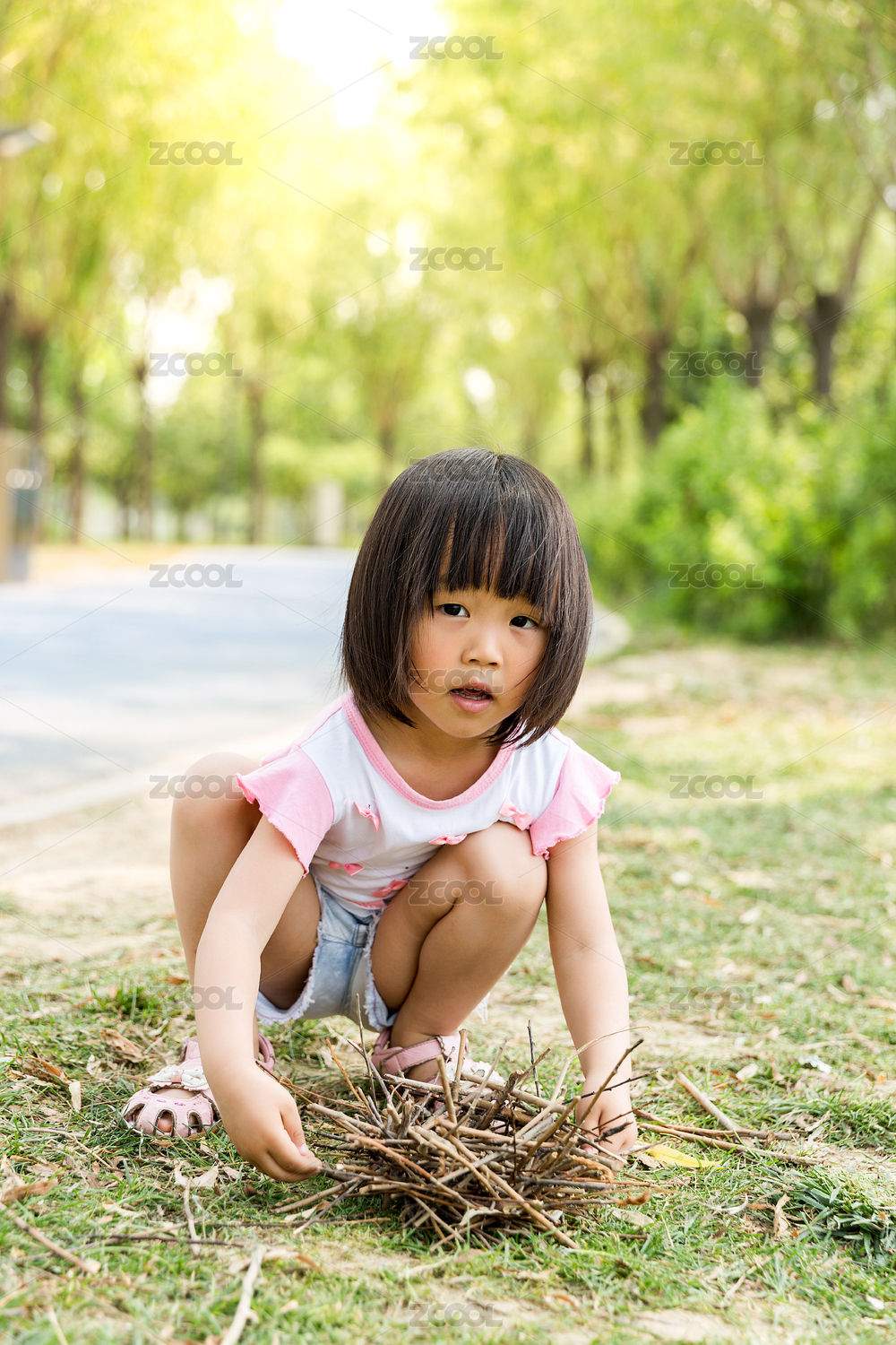 城市郊外公園里用樹枝搭建小鳥窩的小女孩
