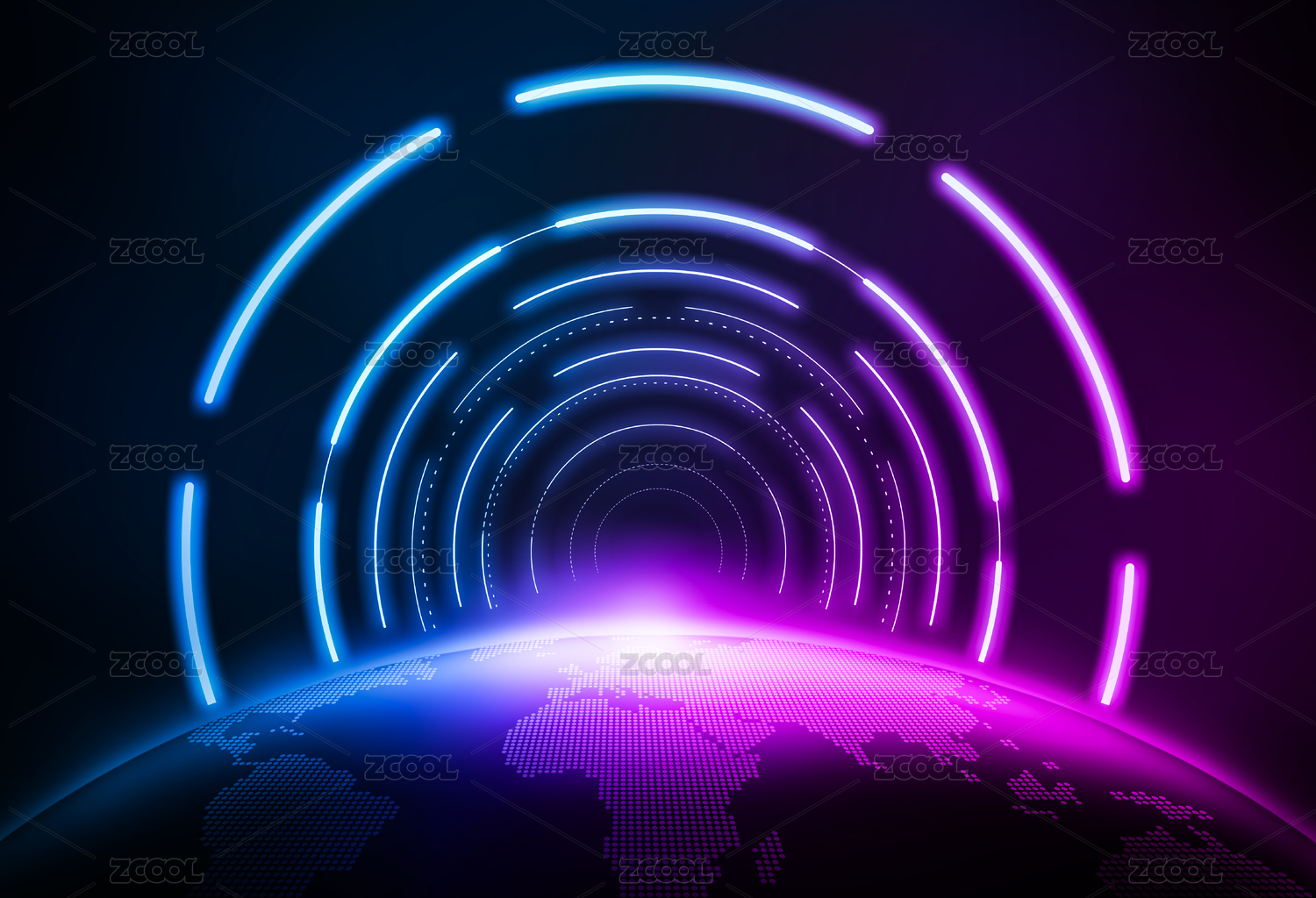 3D渲染搭建在地球表面的霓虹燈管通道空間