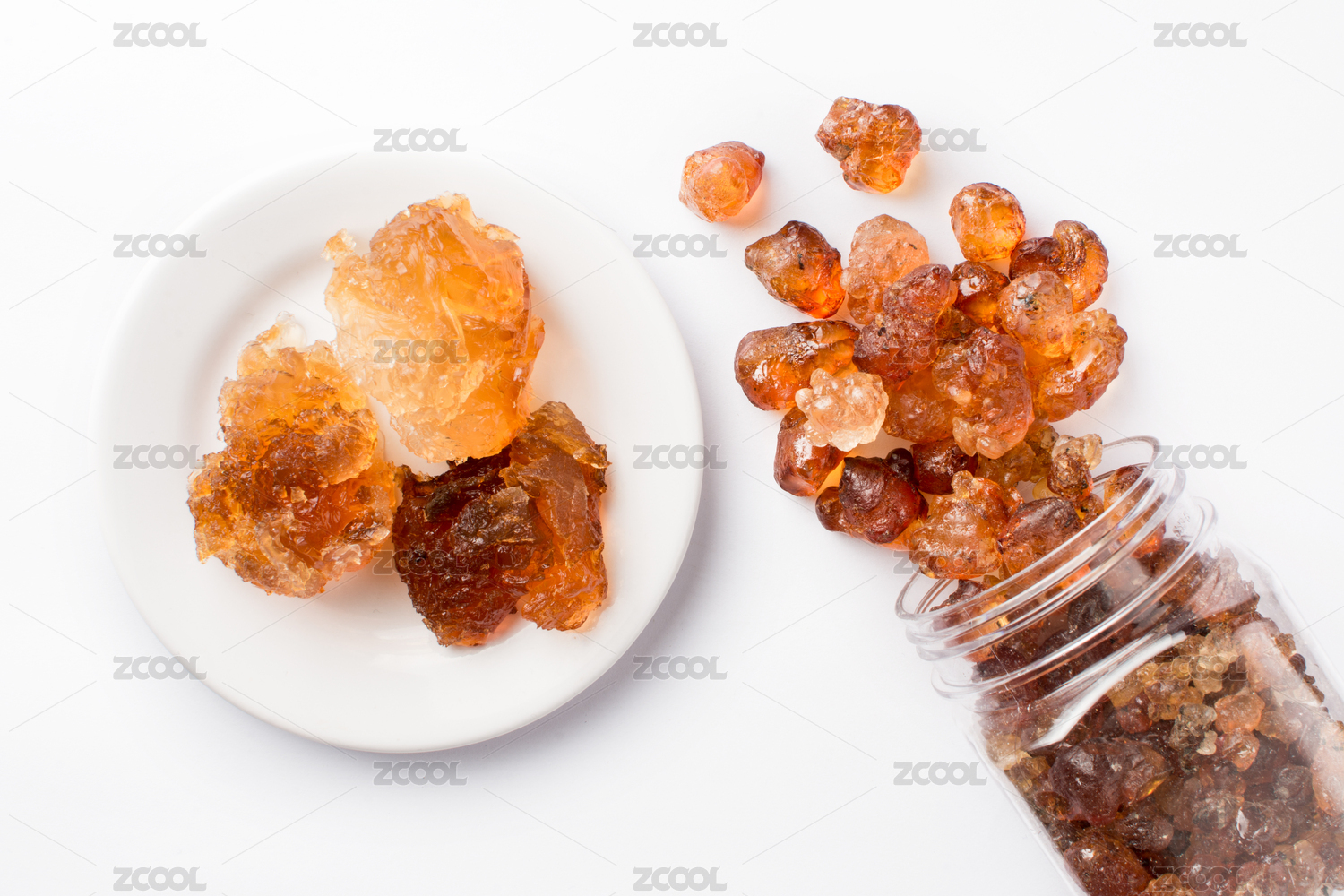 白色背景中從瓶子里面倒出來一些桃膠 美容養(yǎng)顏食材