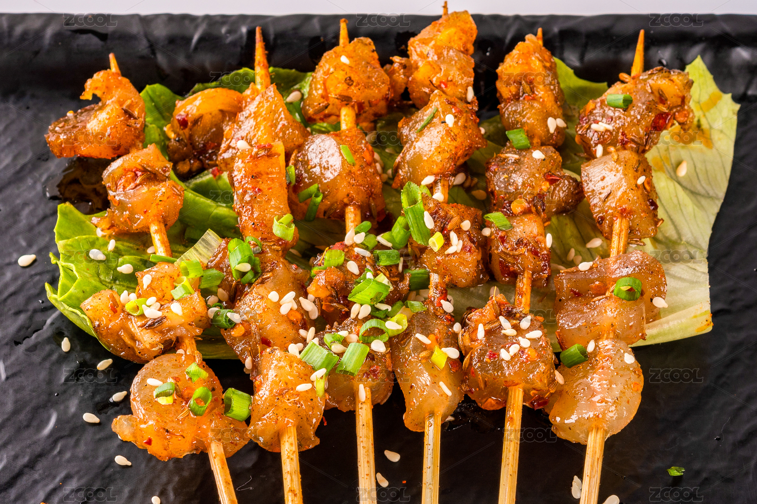 黑色盤里一串串的燒烤牛筋