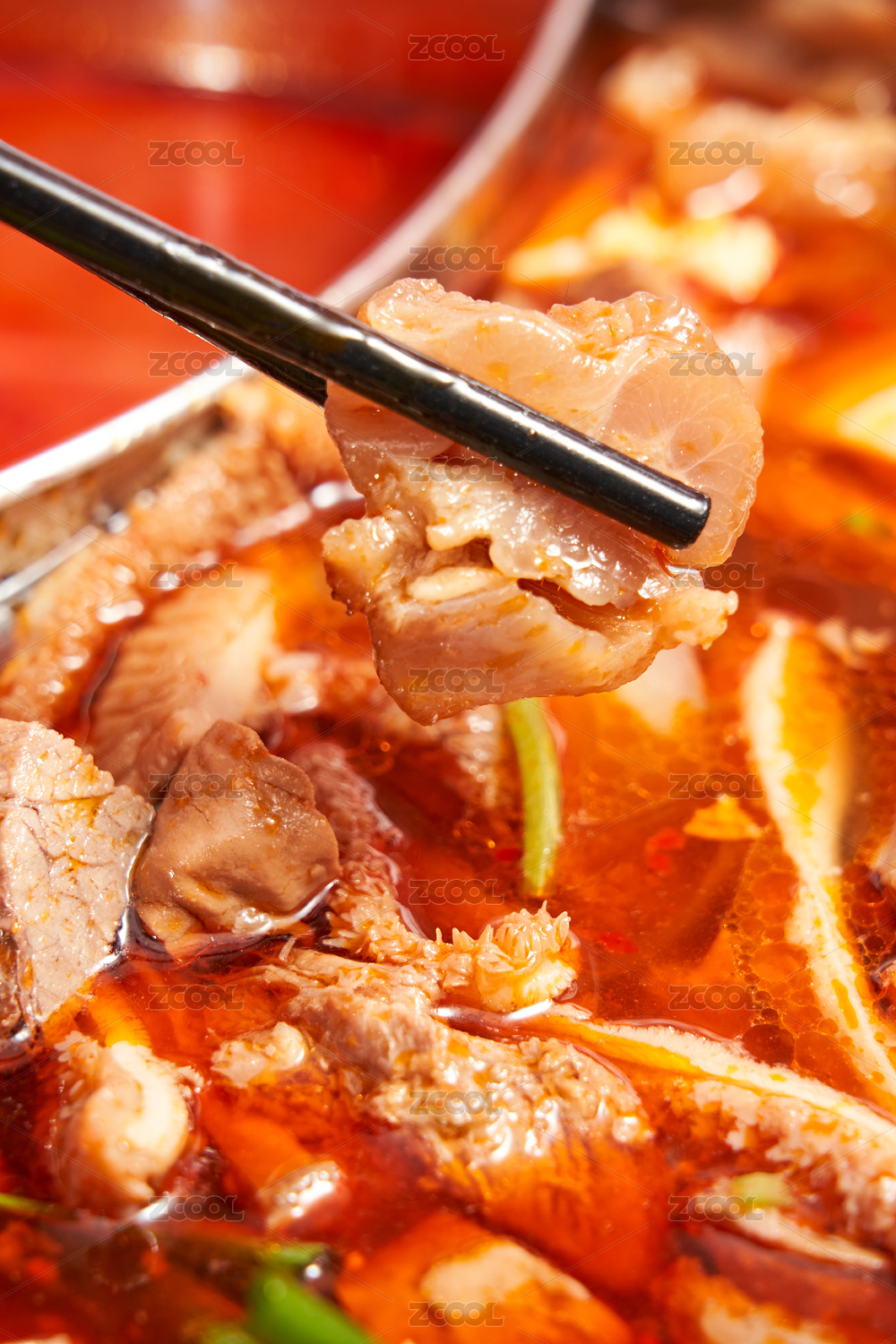 牛雜火鍋中用筷子夾起來的牛筋特寫圖
