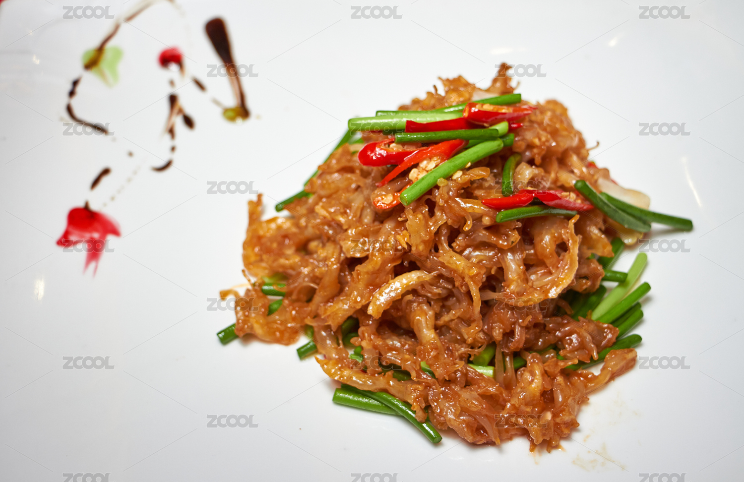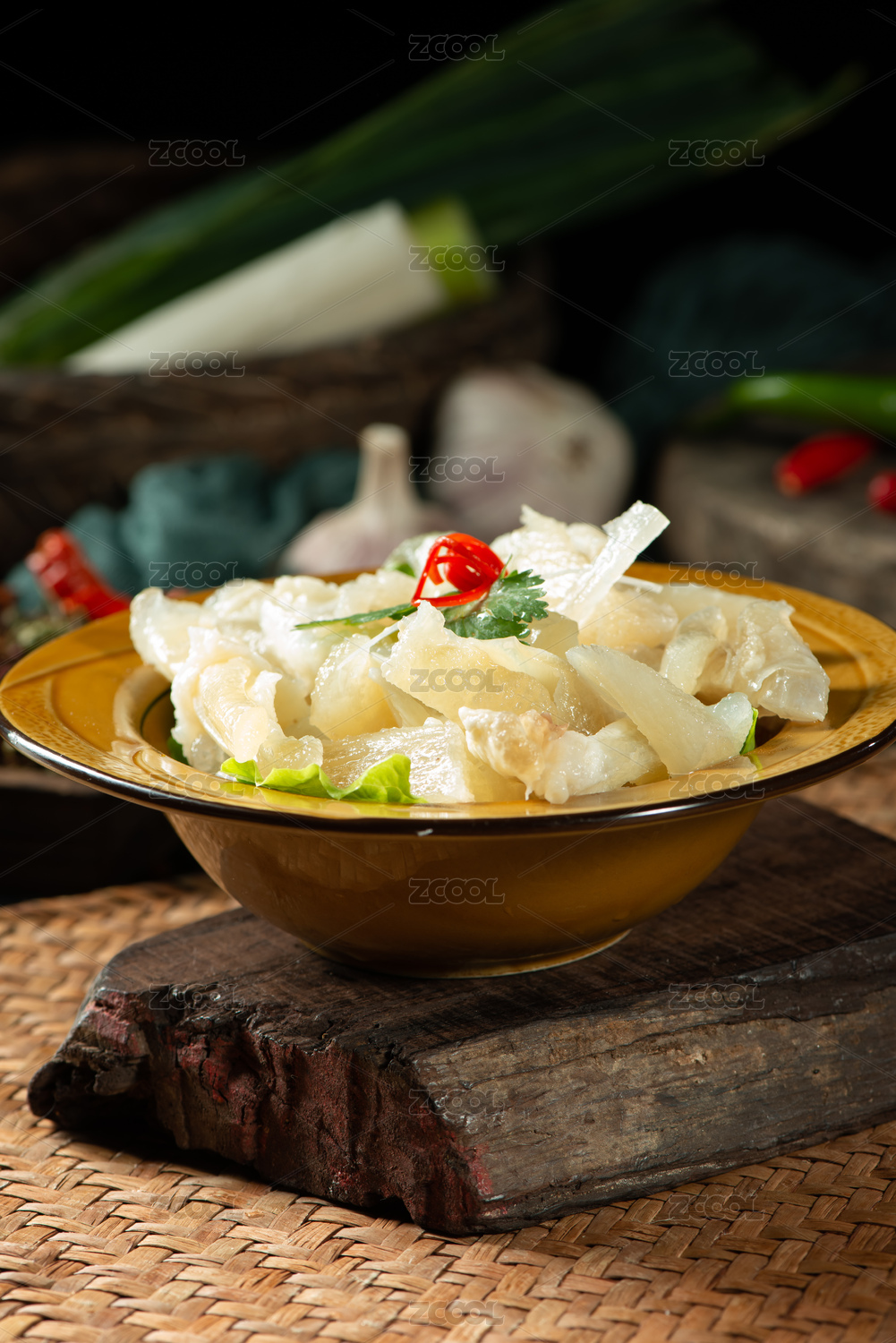 美味的家常菜蒜苗炒牛筋盛放在白色的瓷盤里