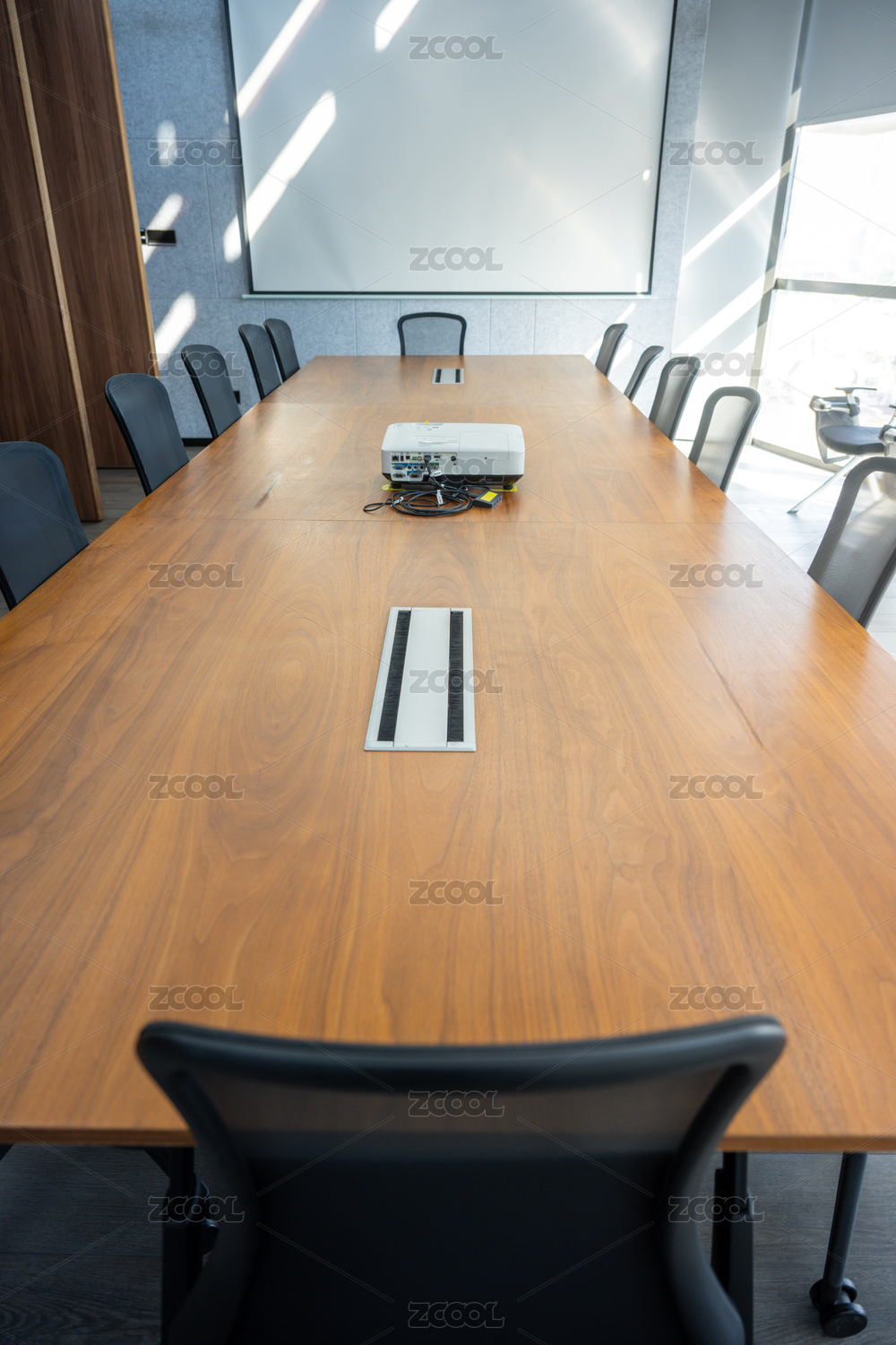 現(xiàn)代化會(huì)議室內(nèi)的長木桌與辦公椅