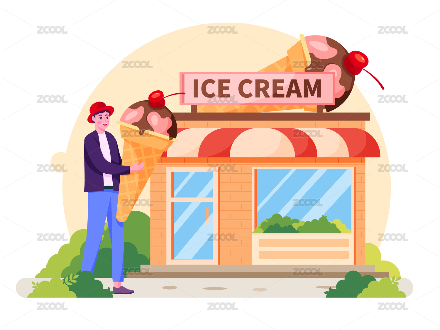 男生拿著冰淇淋站在店鋪門前