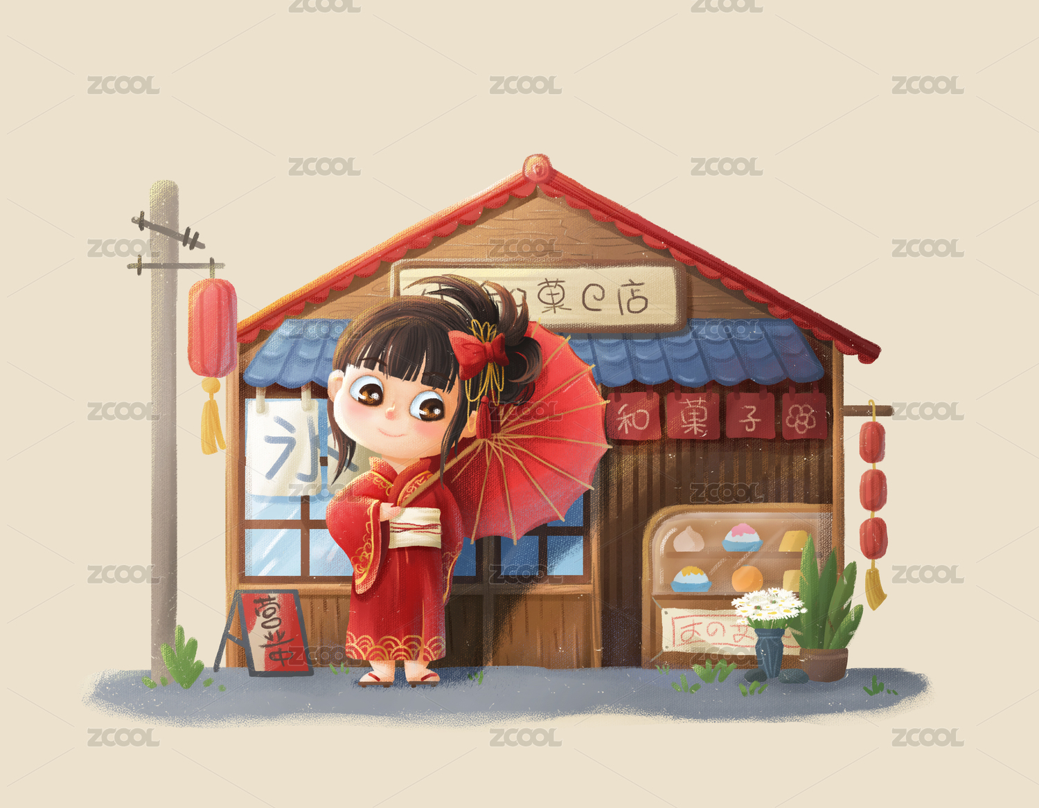 可愛卡通日本和服女孩和店鋪插畫