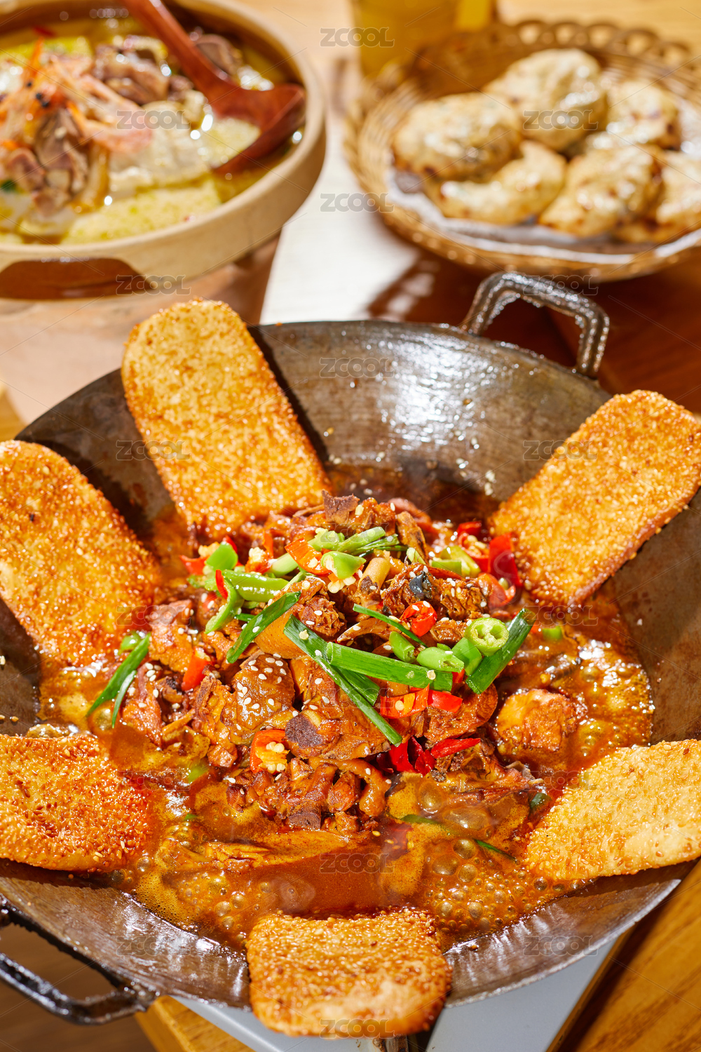 鐵鍋里盛著大公雞亂燉菜