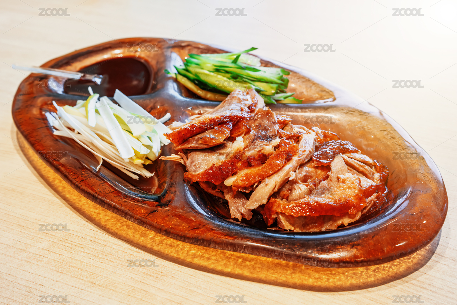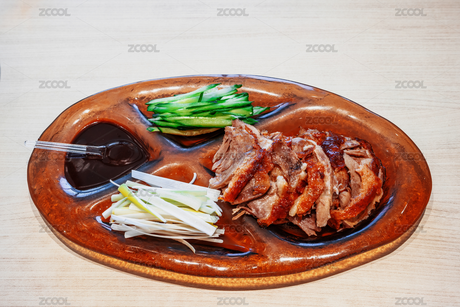 盤子里放著北京烤鴨,黃瓜條,蔥絲和甜面醬