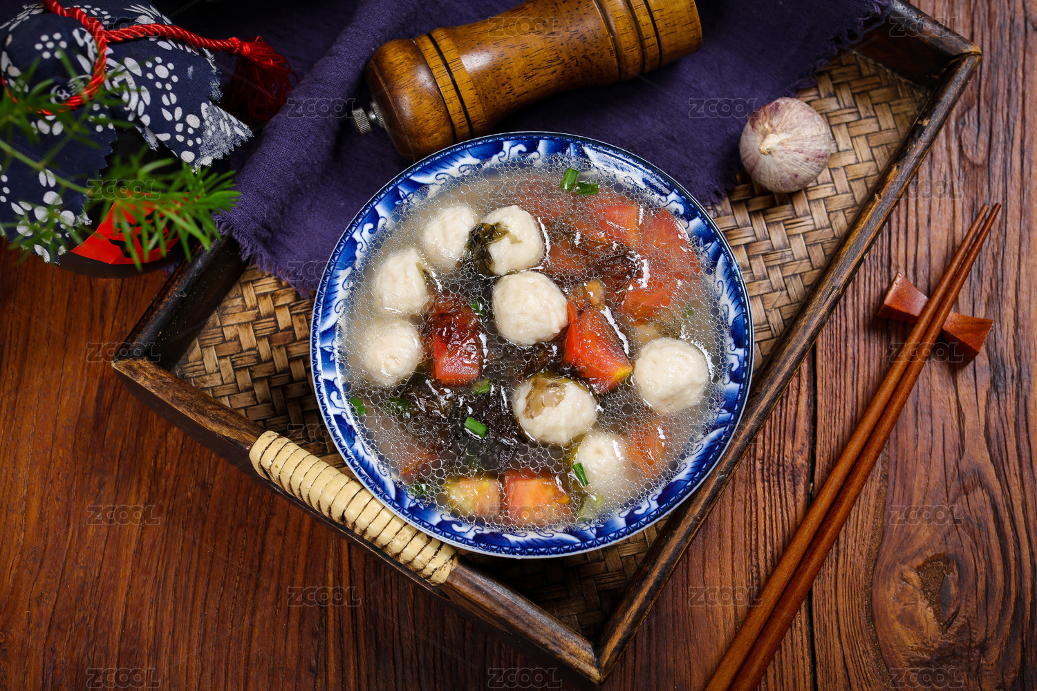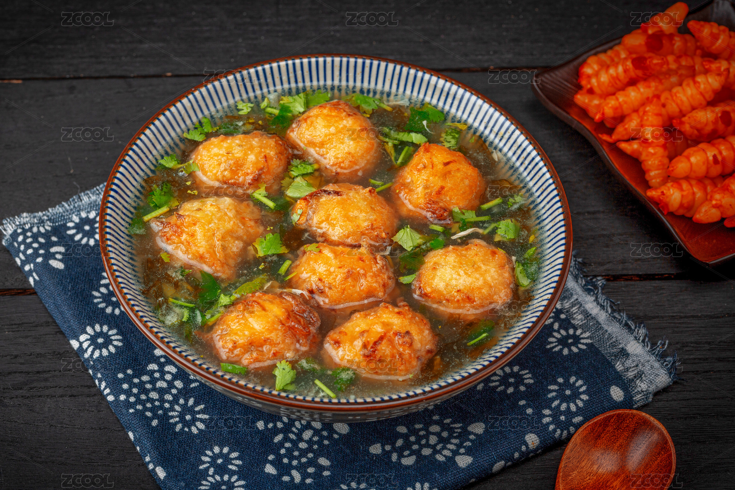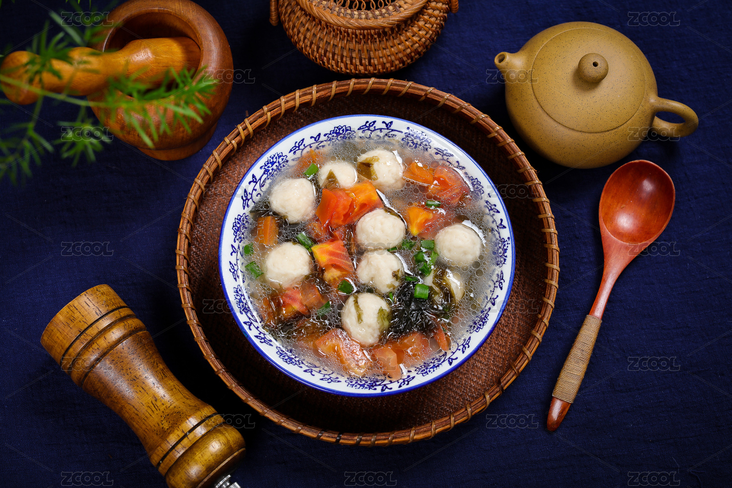 藍(lán)色粗布上的一碗酥肉丸子湯