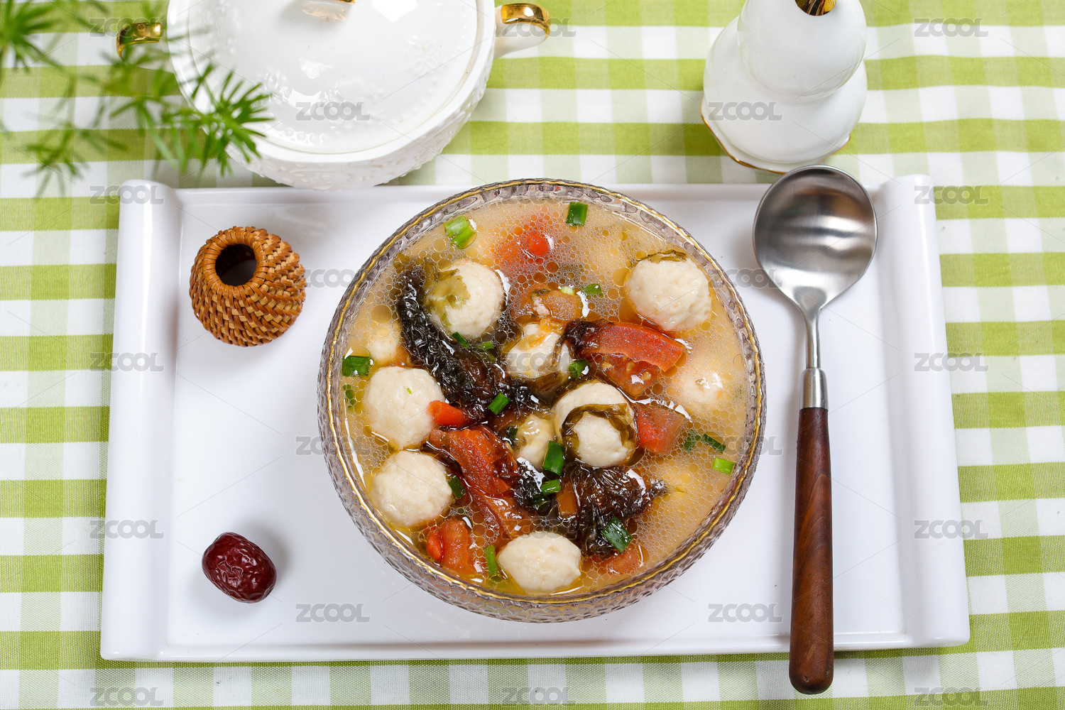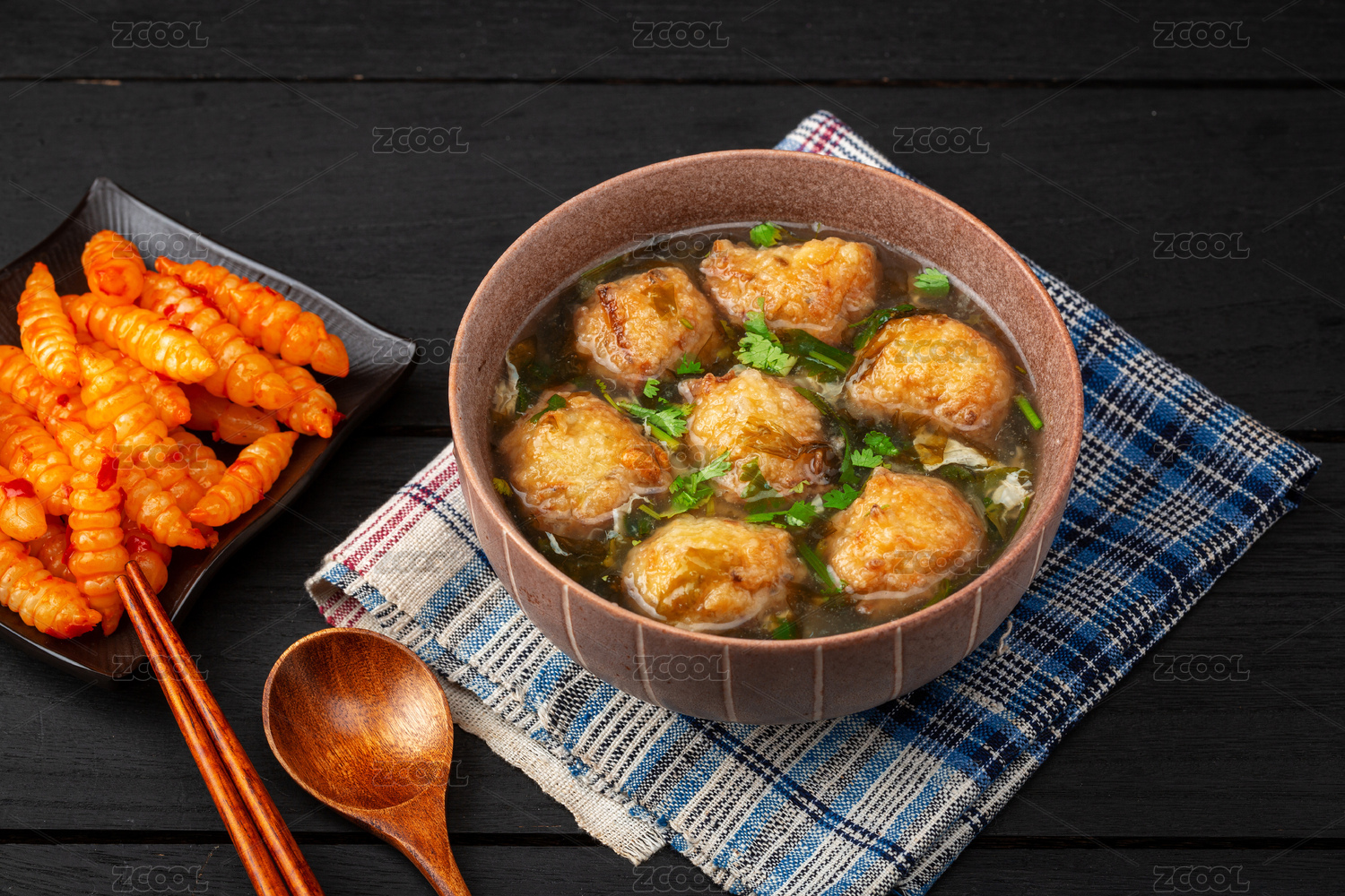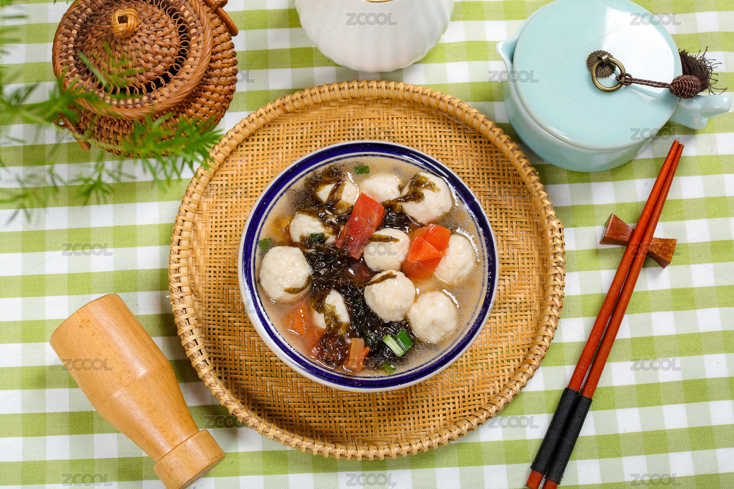 藍(lán)色粗布上的一碗酥肉丸子湯