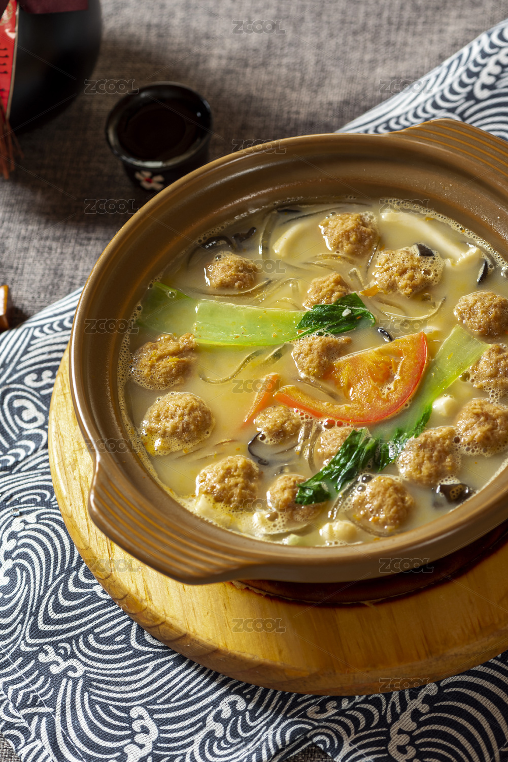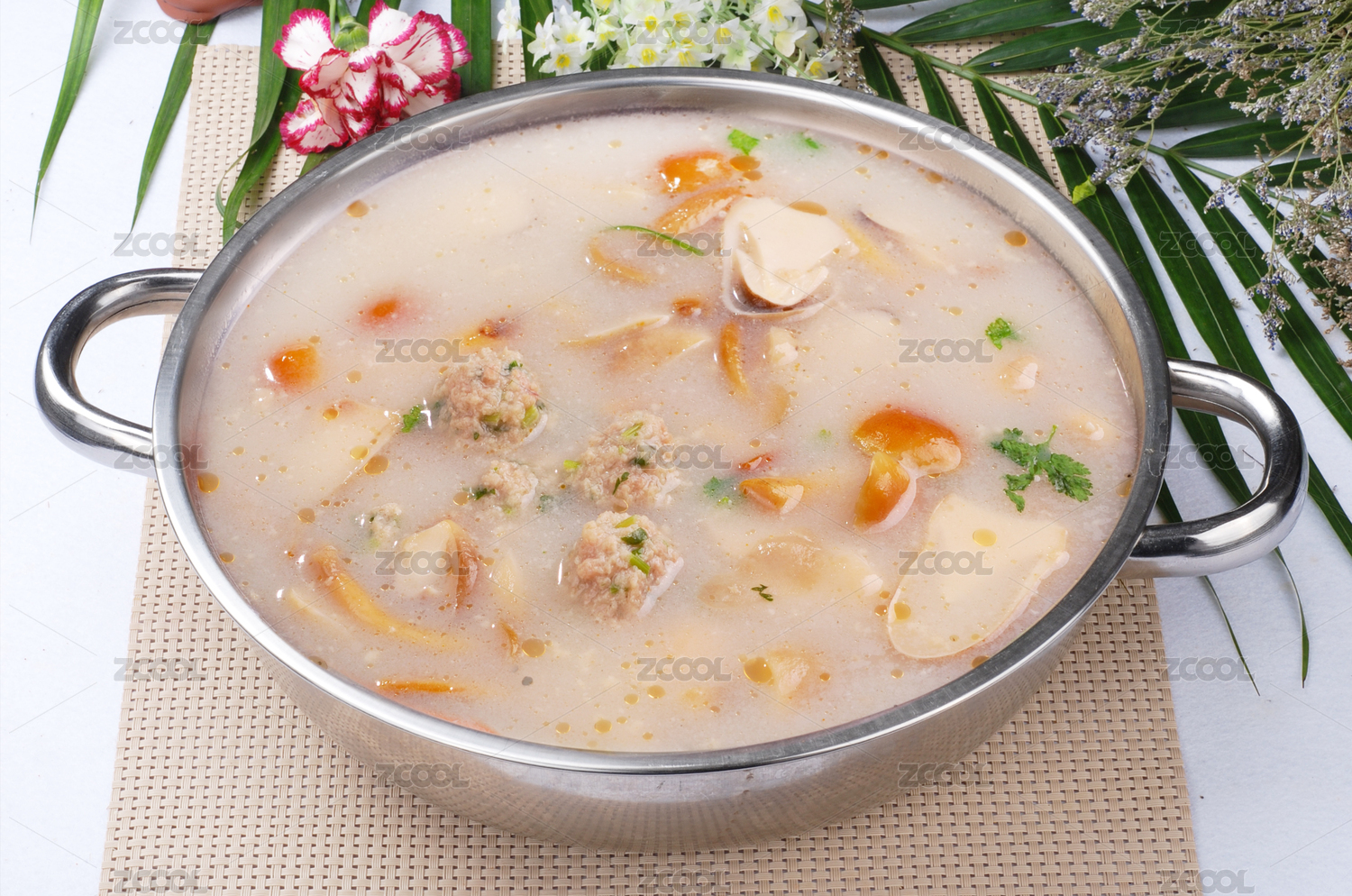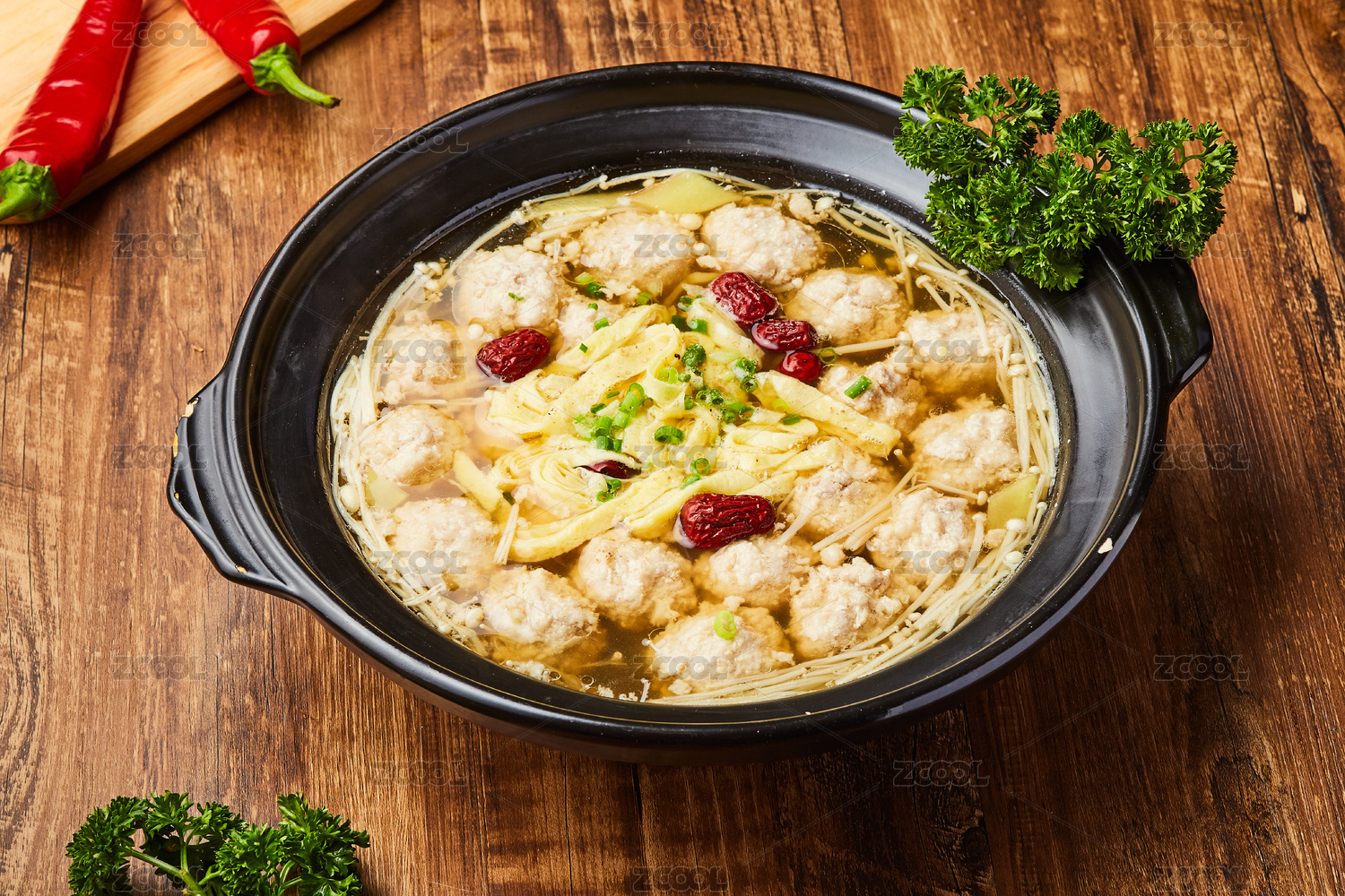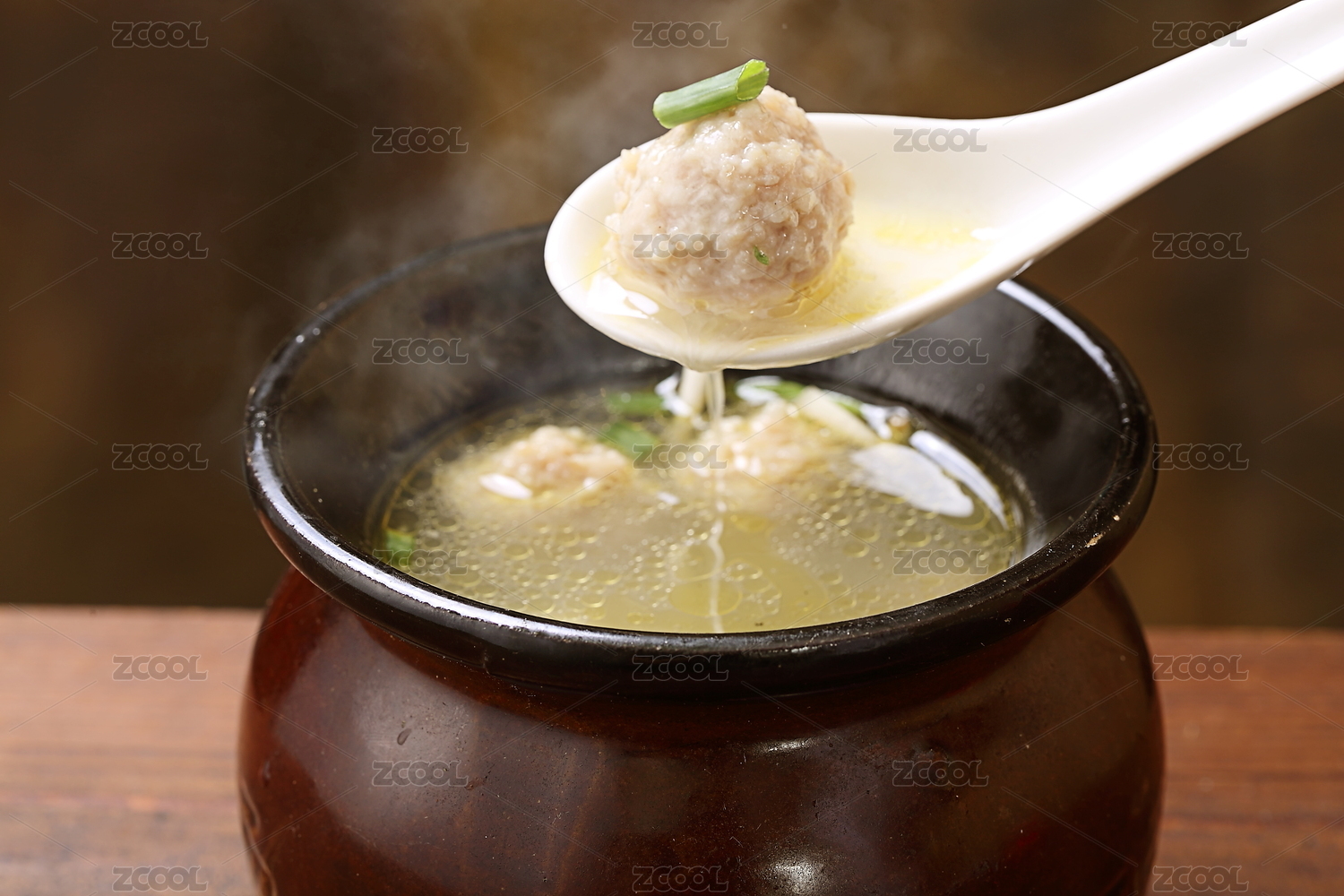 黑色瓦罐里的白色湯勺里的豬肉丸子湯