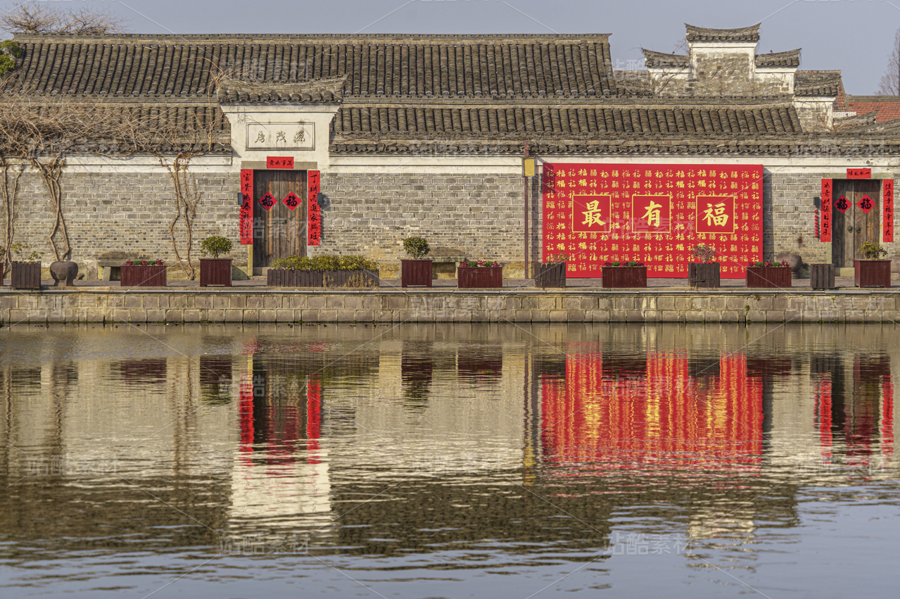 寧波水鄉(xiāng)古民居,春節(jié)福字裝飾與水面倒影
