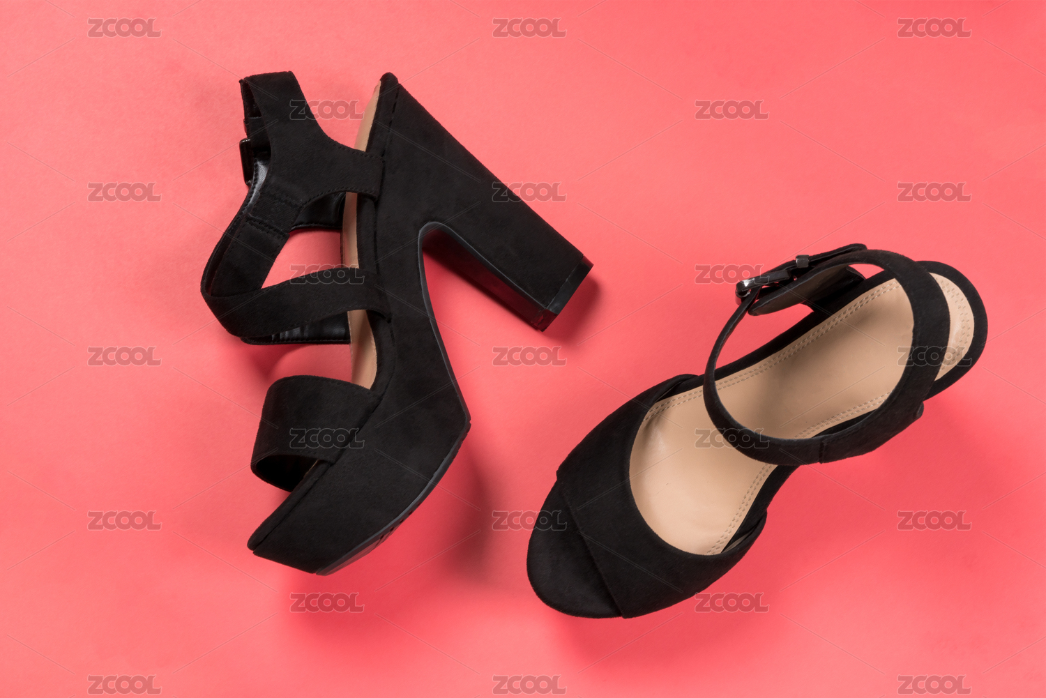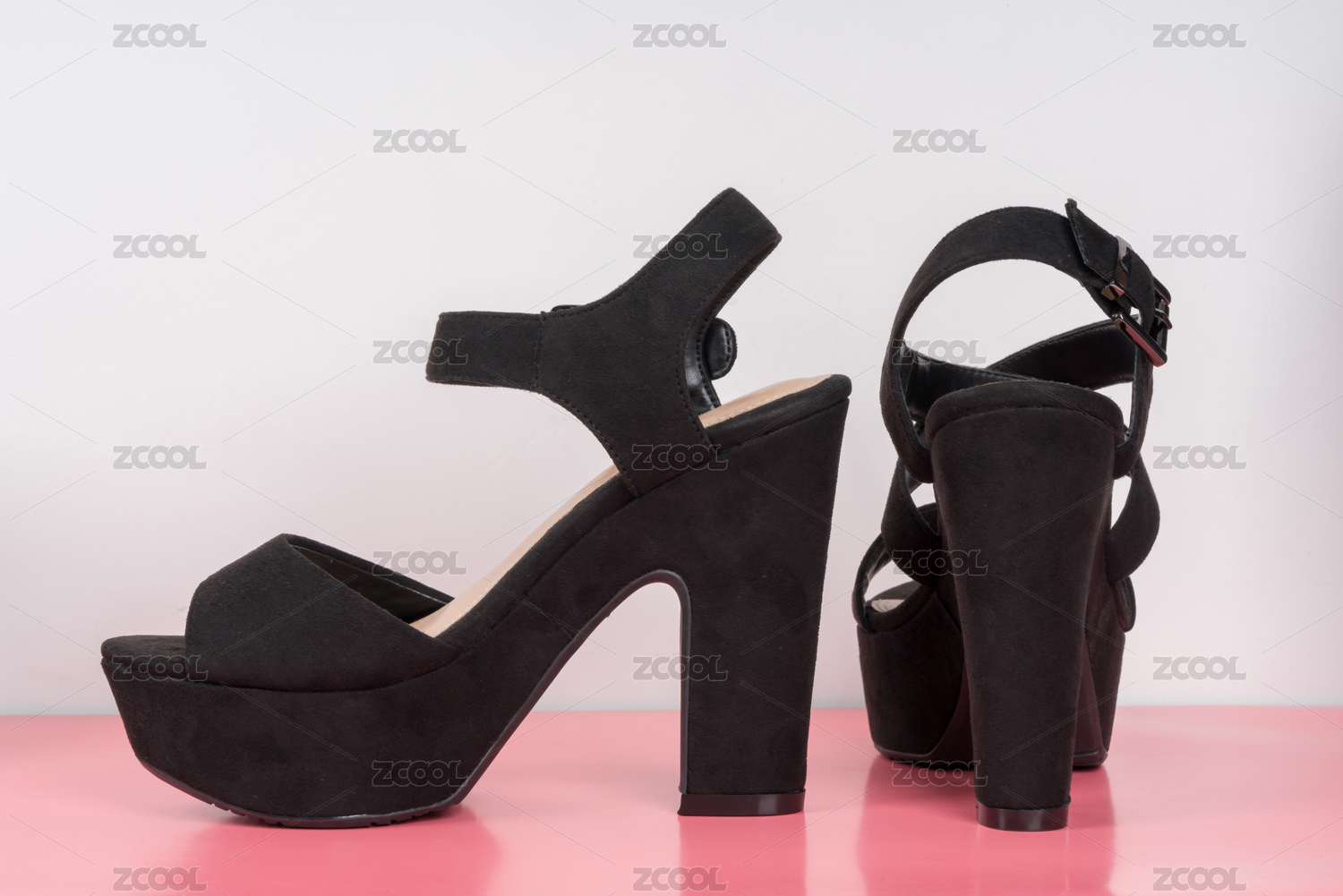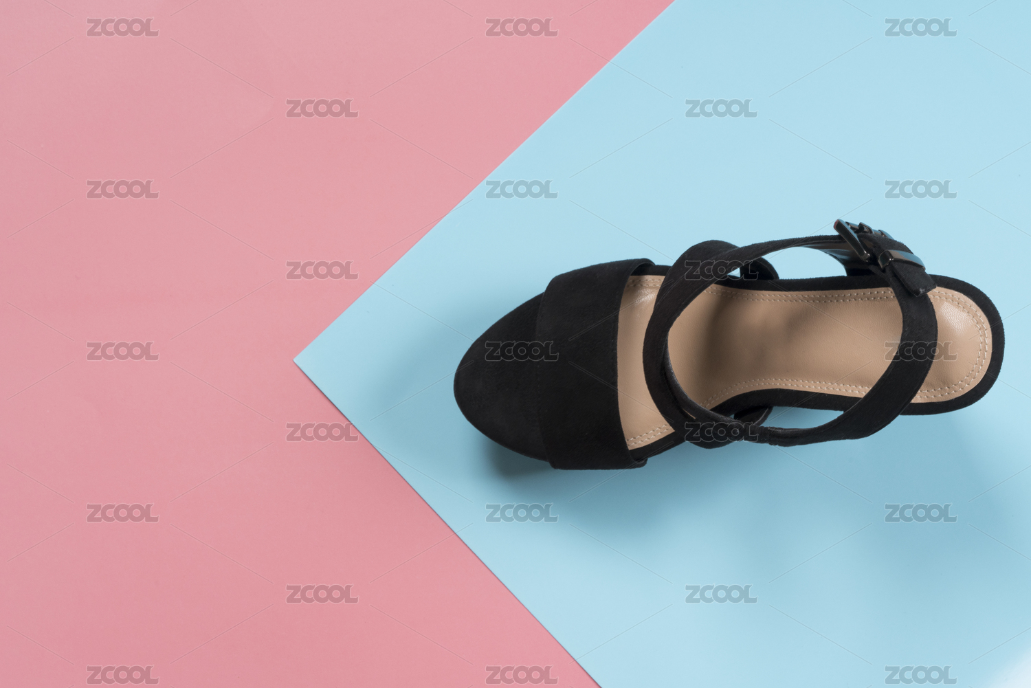 粉紅和粉藍(lán)背景下的黑色高跟鞋