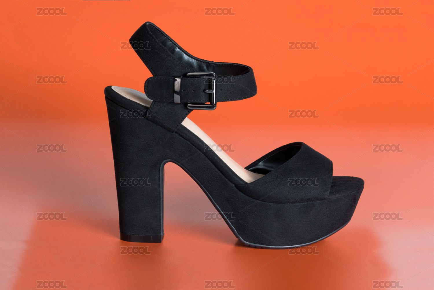 橙色背景上的黑色高跟鞋