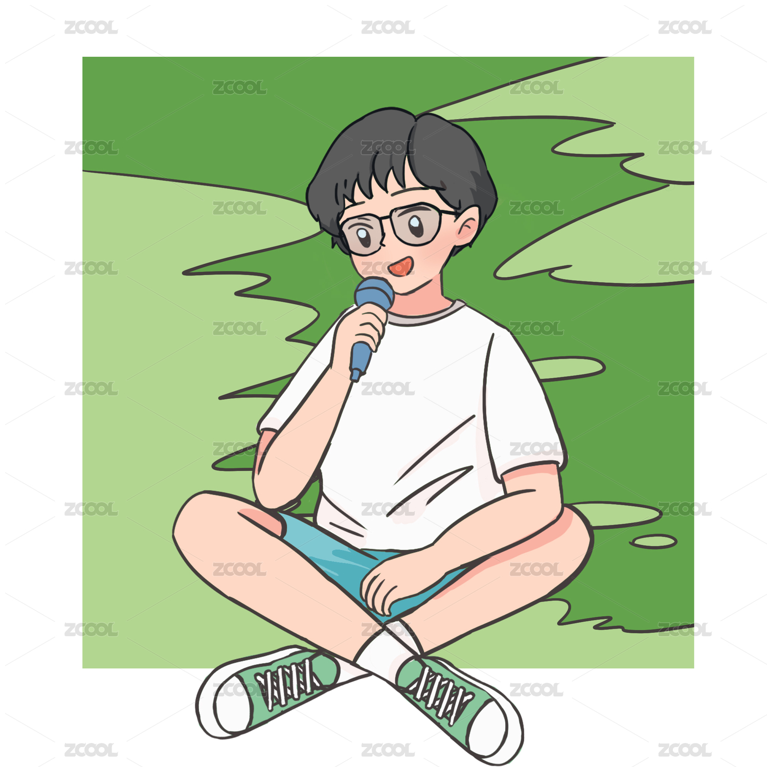 拿著話筒坐在地上唱歌的男孩