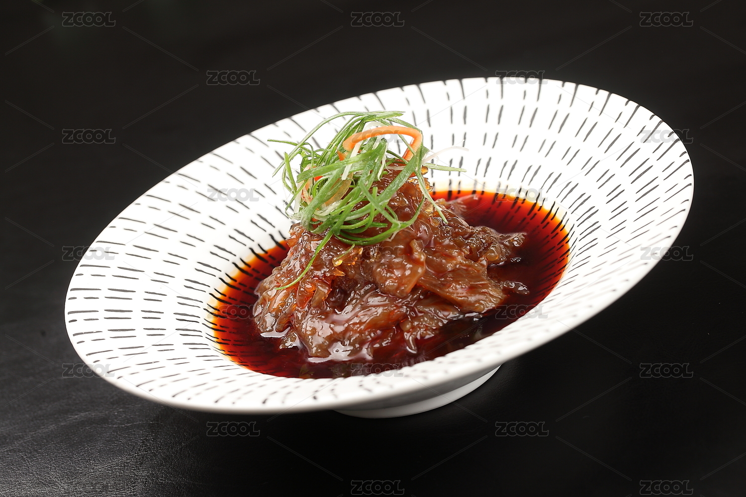 放在深色餐布上的一碗中國傳統(tǒng)家常涼拌菜 — 蘿卜海蜇皮