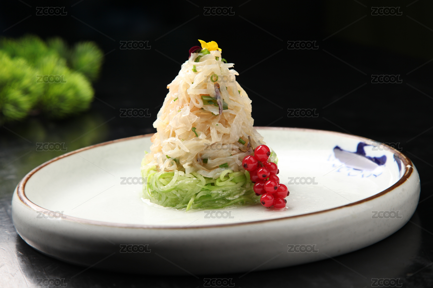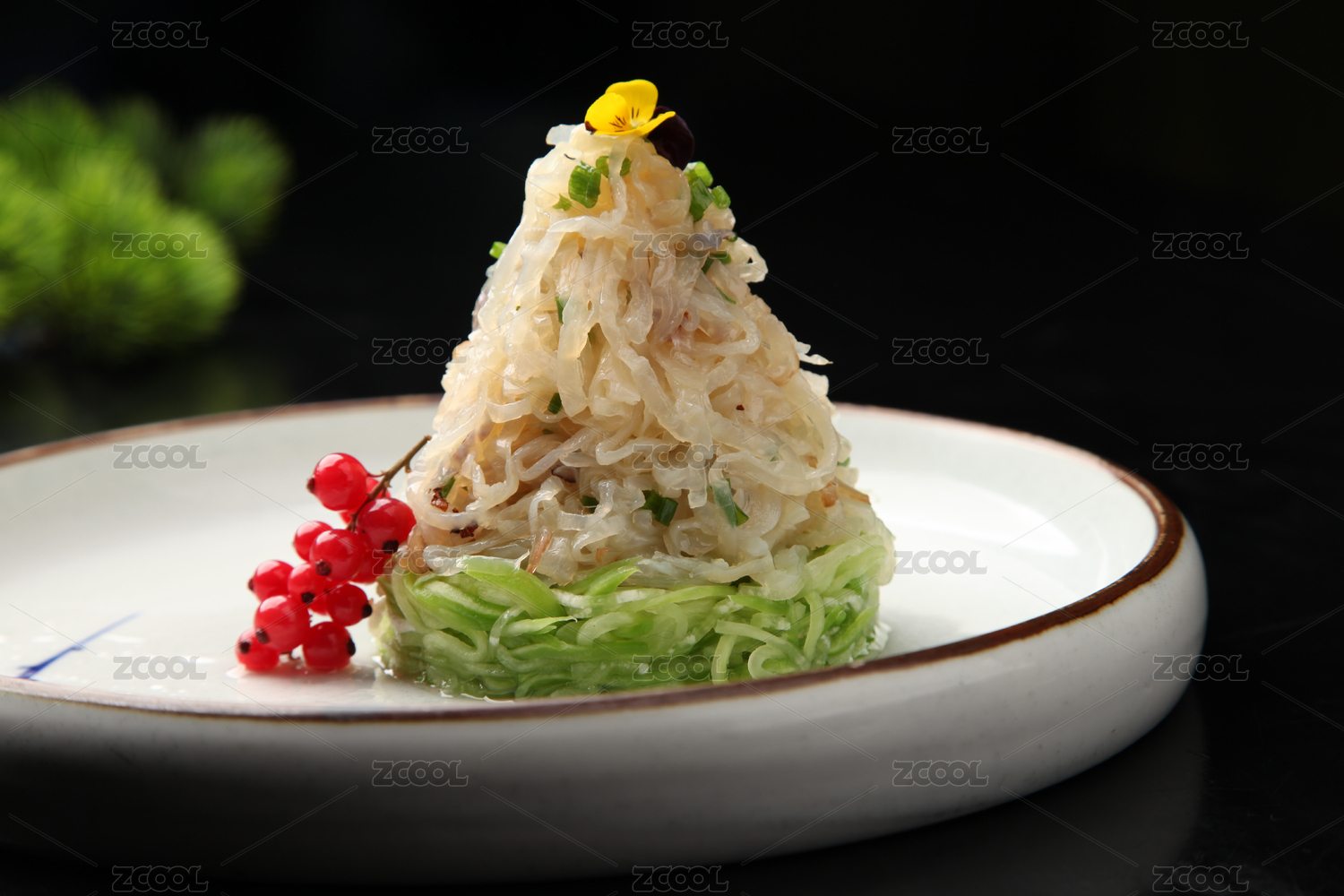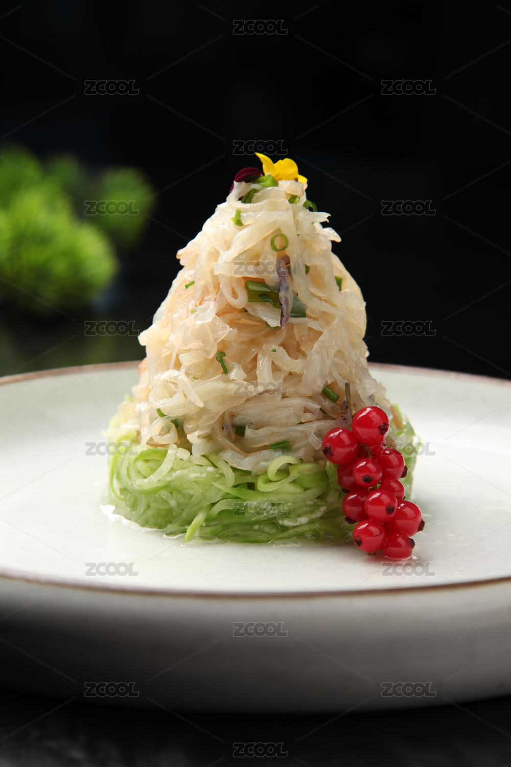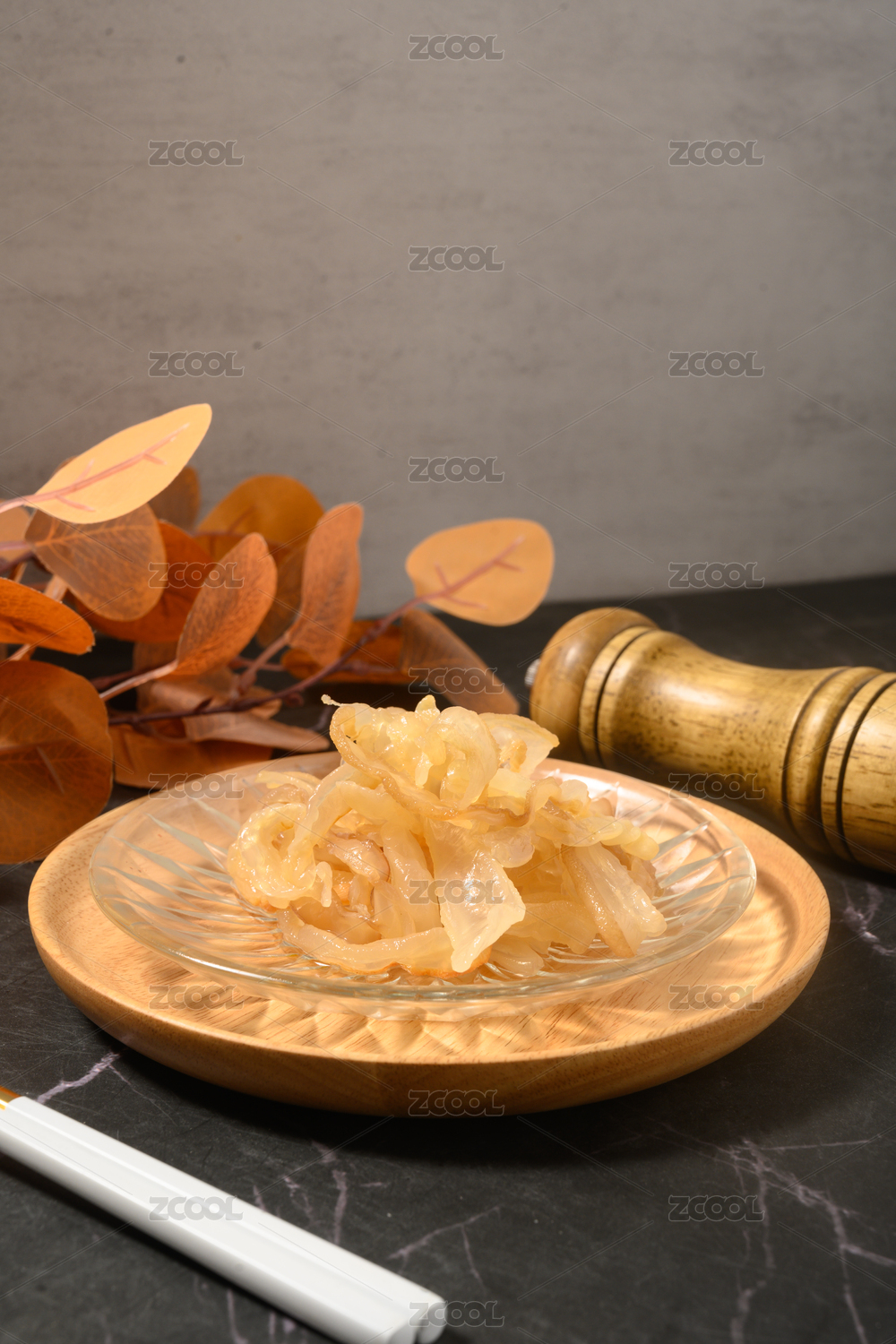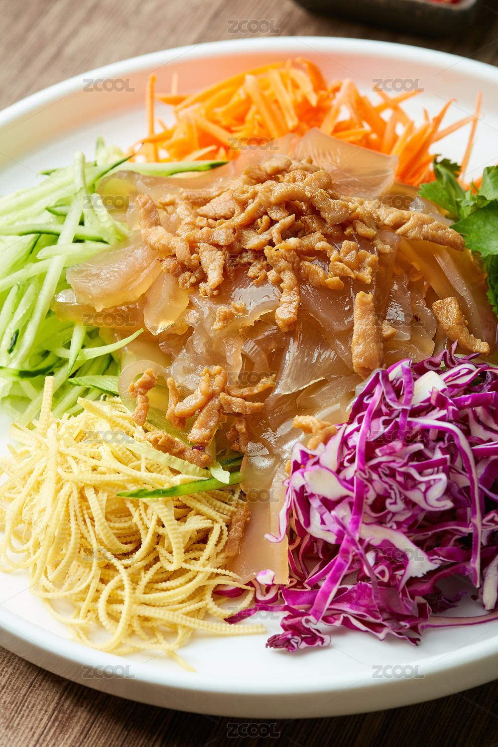 木桌面上白色盤子上裝著一盤海蜇皮