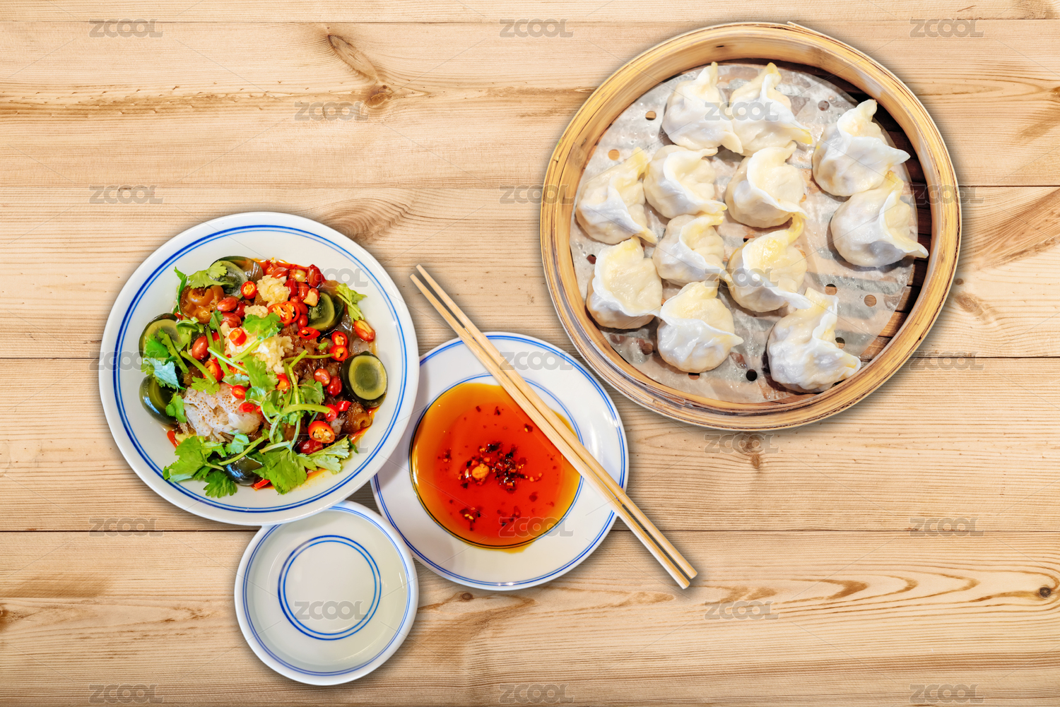 木紋桌面上的圓籠蒸餃和老醋四寶涼菜