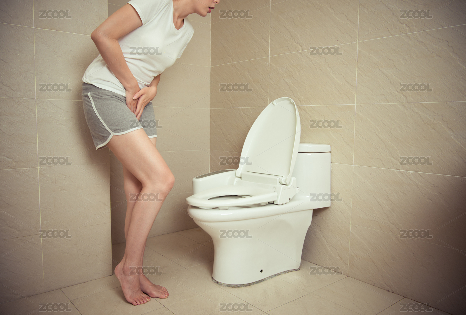 切的有吸引力的年輕女孩感覺尿急站在馬桶前,在家里用雙手放在浴室觸控位置的照片。