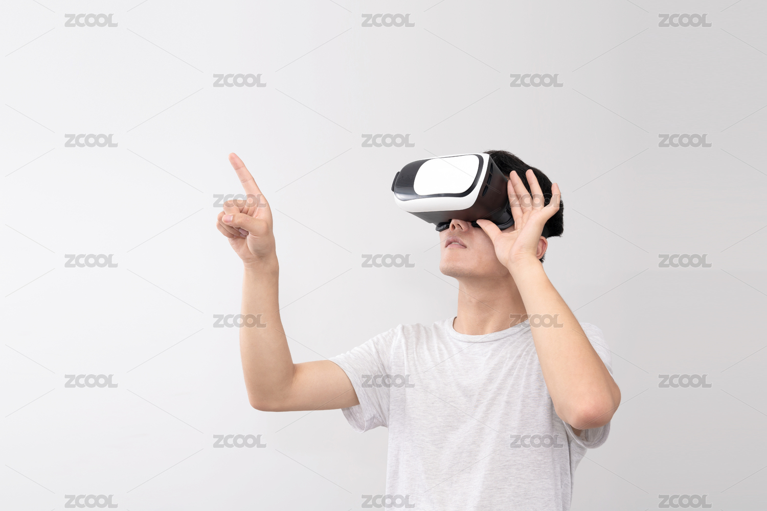 帶著VR眼鏡的男士向前伸出手指,觸控概念