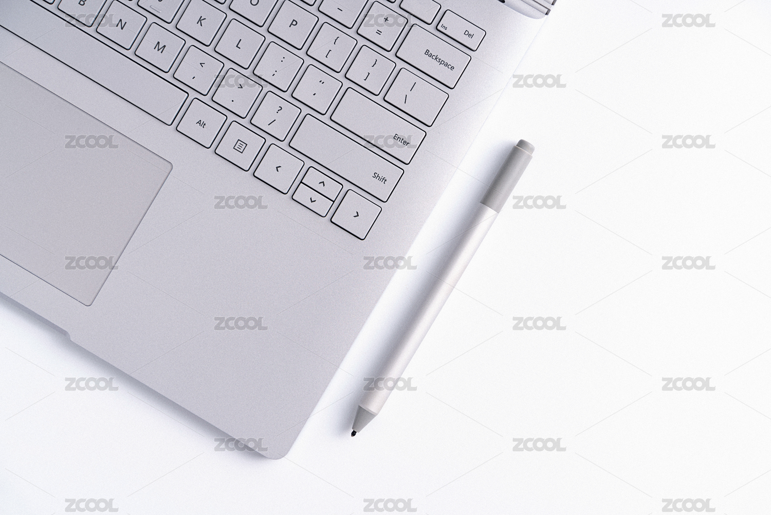 銀色的筆記本電腦和觸控筆擺放在白色背景上,辦公場景