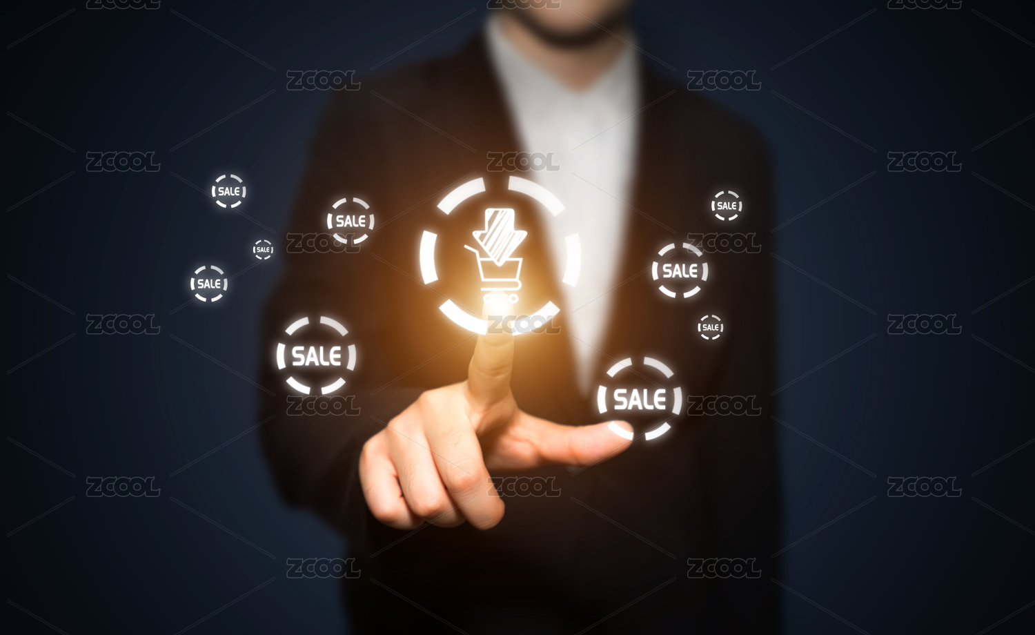 商務(wù)人士手觸控購物車進(jìn)行下單下載訂單在線移動支付的科技感概念