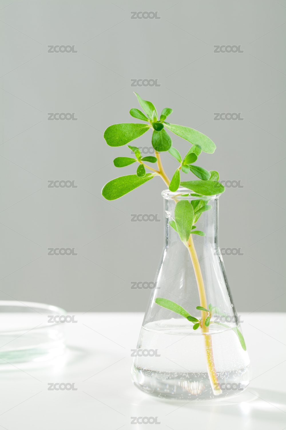 桌面的燒瓶里有一段馬齒莧嫩芽