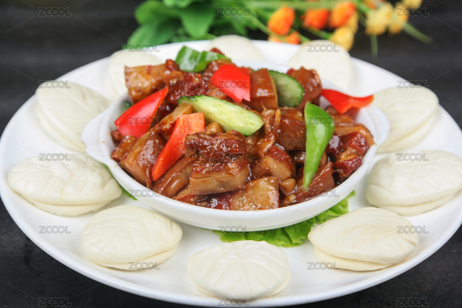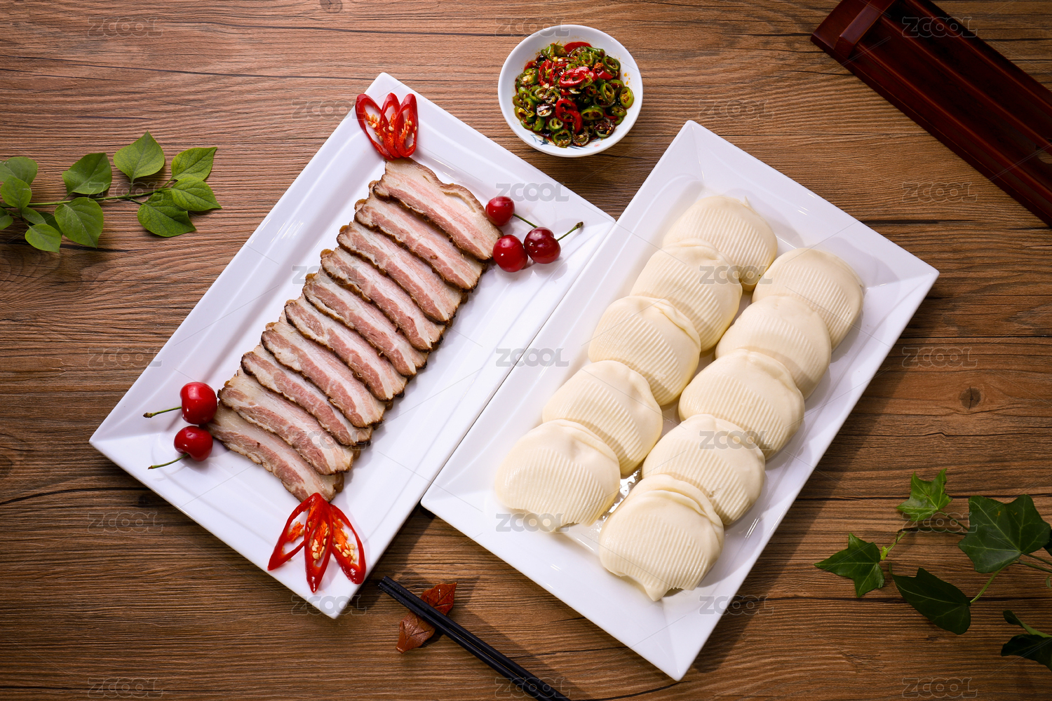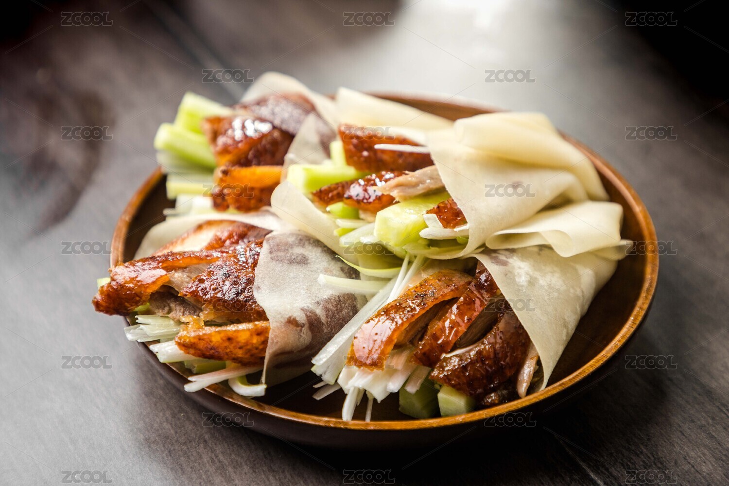 放在木紋背景上盤子里的牛肉片和荷葉餅