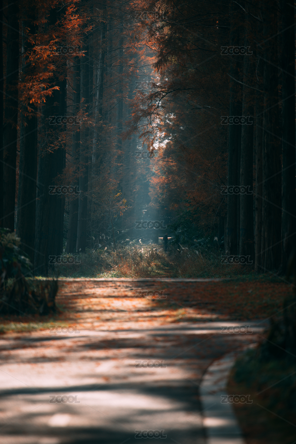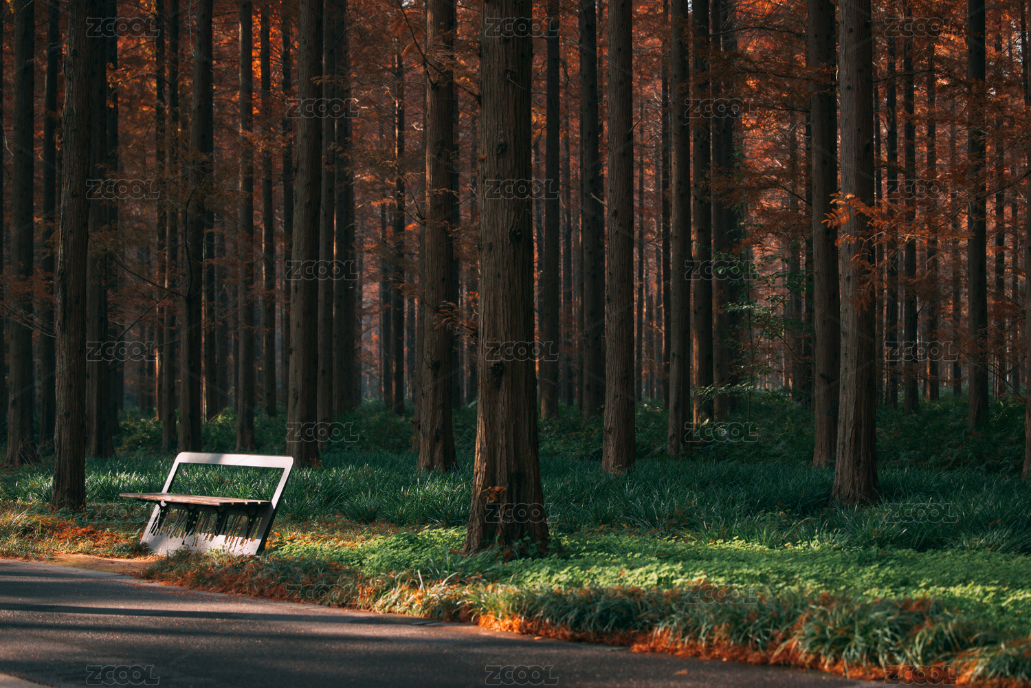 秋天暖光下的水杉林