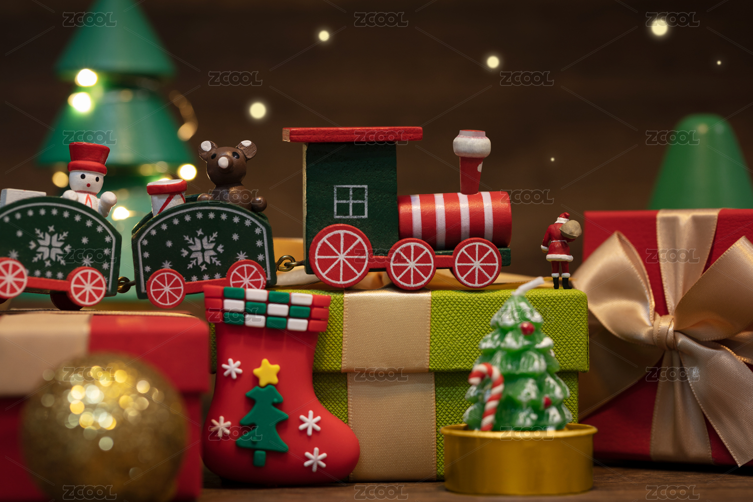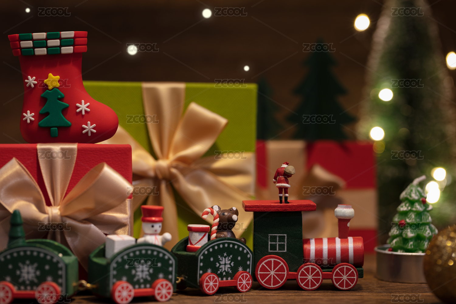 微縮創(chuàng)意暖光下的圣誕節(jié)裝飾與圣誕老人